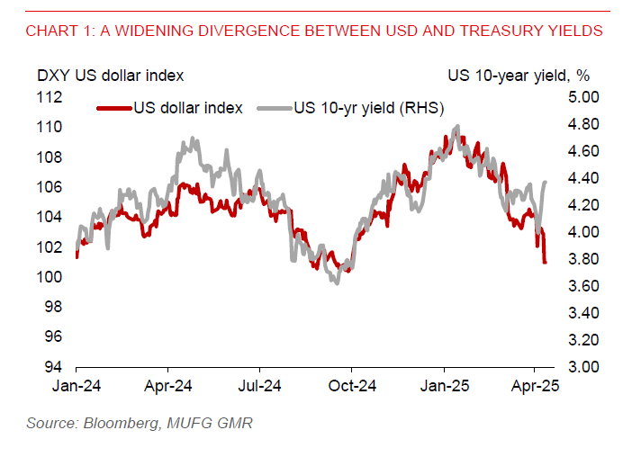 The US dollar has had its worst day since November 2022, falling by 1.9%. USDJPY has also continued to weaken, benefitting from safe-haven flows and narrowing yield spreads with the US. Trump’s tariff relief has also proved to be short-lived for equity markets, as they had resumed their decline, likely driven by worries about the negative impact of tariffs on global growth. Brent prices have also declined on the back of global growth concerns, while gold prices have stayed resilient.