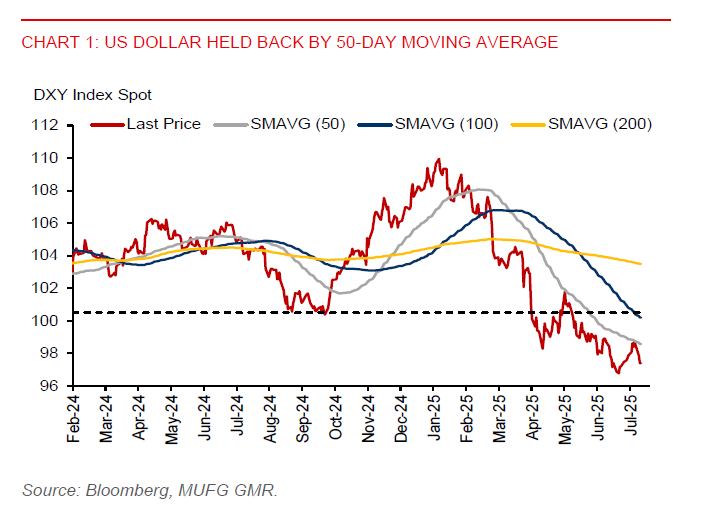 On trade, the scheduled rollout of reciprocal tariff on 1 August looms large. In the absence of new US trade deals, there’s a risk that tariff levels could revert to the steeper rates announced during US Liberation Day in April. This uncertainty is weighing on the US dollar. Trump has reportedly said that smaller countries will be assigned a blanket tariff rate of between 10%-15%.