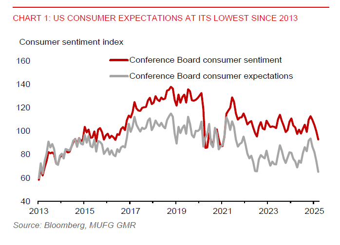 US dollar has weakened by 0.2%, while US Treasury yields have also inched lower, after US consumers show further signs of weakness. The Conference Board consumer sentiment index fell to 92.9 in March from an upward revised 100.1 in February. This is below market expectations of 94.0. Notably, consumer expectations also fell to 65.2 in March from an upward revised 74.8 in February, marking the lowest level since 2013. There could be some moderation in consumer spending in the months ahead, which will slow the US economy.