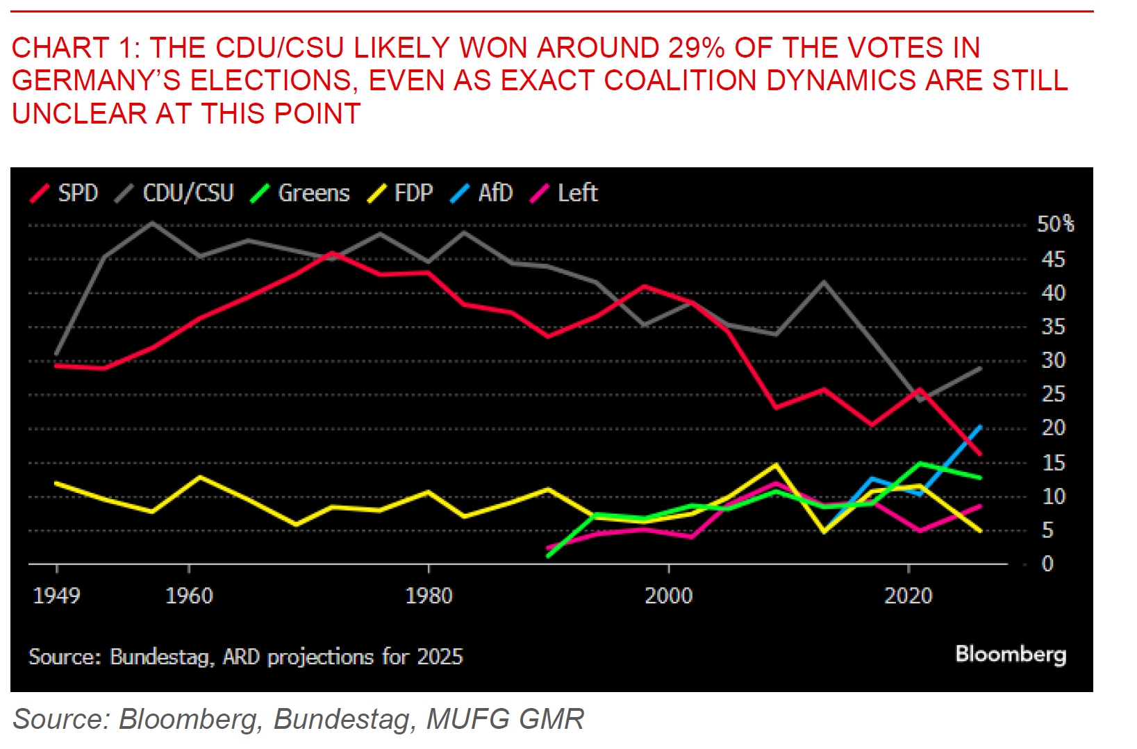 The EUR traded slightly higher in Asia open and the Dollar weaker, as latest projections from Germany’s election results showed Federich Merz’s CDU/CSU winning 29% of the votes, and finishing ahead of the far-right AfD party (20% of votes) and the ruling Social Democrats (16%). Nonetheless, with lack of clarity around whether some of the smaller parties such as FDP and BSW cross the 5% threshold to enter parliament, there remains uncertainty around the specific coalition dynamics. In particular, if these smaller parties enter parliament, the CDU/CSU may need a three-party coalition including the SPD, which could make reforms and policy making more unwieldy. Overall, the direction of travel for Germany is likely for policies to kick start growth in Germany including loosening regulations, lowering corporate and income taxes, and reforming the debt brake to allow more government investment in coming years, even as the pace and likelihood of reforms will also be determined by exact coalition dynamics (see note from our G10 team - Global FX Weekly 7 Feb).