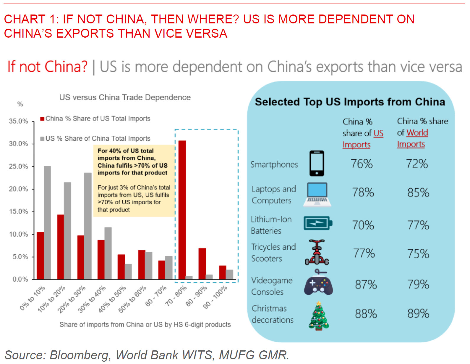 Our calculations show that for a meaningful 40% of US total imports from China, China fulfils >70% of US imports for that product. This similar number is just a miniscule 3% for the US.