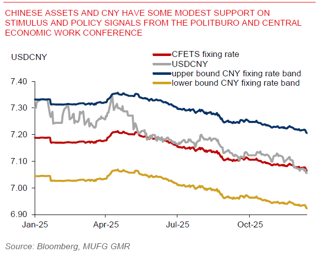 Chinese assets and CNY have some modest support on stimulus and policy signals from the politburo and central economic work conference