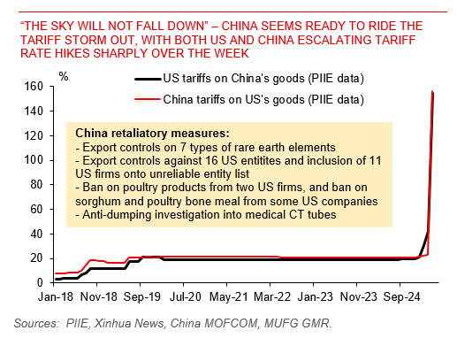 Nonetheless, we think the worst is not over for Asia FX. The most crucial development is the sharp escalation in trade and tariff tensions between the US and China, with US hiking tariff rates by a cumulative 145%, with China responding with a 125% tariff hike together with a whole host of retaliatory measures such as export controls on rare earth minerals.