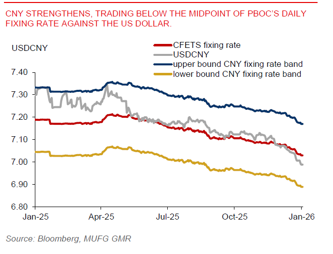 CNY strengthens, trading below the midpoint of PBOC’s daily fixing rate against the US dollar
