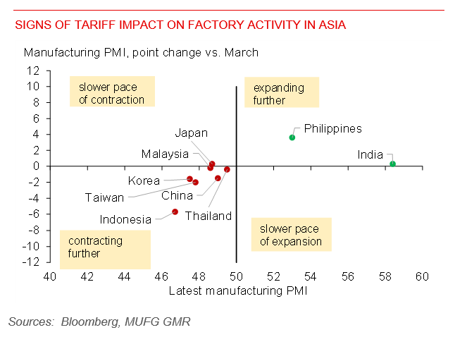 Asia FXs market behaved as if the tariffs uncertainty has already peaked. However, the path towards a deal is still far and bumpy, especially for the negotiation between US and China. China Ministry of Commerce’s statement also mentioned that “if the US wants to talk, it should show its sincerity and be prepared to correct its wrong practices and cancel unilateral tariffs”. Near term, we expect continued negative data releases on exports and other activity numbers. Poor April manufacturing PMIs across Asian economies (except Philippines and India) gave clear signs of negative impact of the tariffs on the economy. Still, the basis for a sustained rally for Asian currencies isn’t solid.