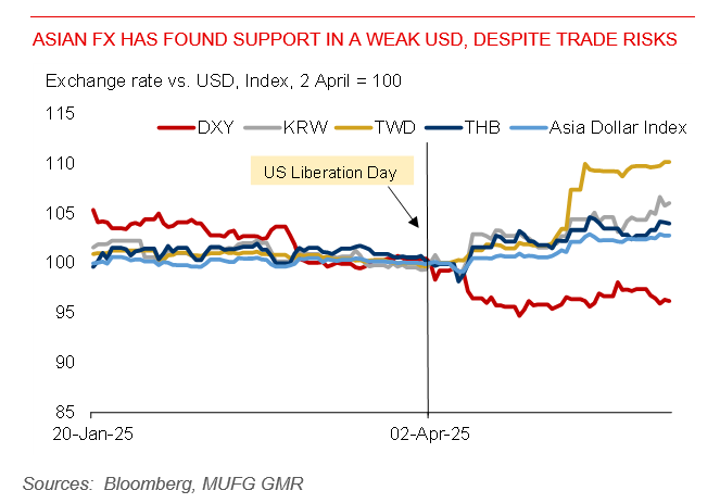 Asian currencies have continued to find support in a weaker US dollar. Markets have seemingly perceived that President Trump is looking for a weaker US dollar versus several Asian currencies as part of bilateral trade negotiations. Bloomberg news recently reported that the Taiwanese authorities had allowed the TWD to appreciate sharply earlier this month. The deputy governor of CBC has said that this strategic move is to allow market expectations for TWD gains to play out. But this is apparently at odds with the Taiwan central bank’s past preference to intervene in the FX market to smooth out volatility. The Korean won has also advanced sharply on the news that the US-South Korea finished the second technical discussions on 22 May. The Thai baht is also a notable gainer against the US dollar this week, though Thai commerce minister has denied that FX policy will be part of the trade talk. References to FX manipulation by Trump and US Treasury Secretary Scott Bessent have likely helped to fuel market speculation for lower USD/Asia pairs.