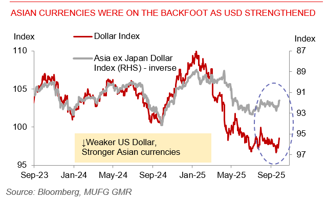 The week has been dominated by a stronger US dollar which spilled over into regional Asian currencies as well, underpinned by better US macro data and higher Treasury yields. Beyond the macro, sentiment was also tempered by new US tariffs targeting pharmaceuticals, heavy trucks, and furniture, alongside geopolitical tensions and uncertainties around a possible US government shutdown. These developments have kept Asian currencies under pressure, with high-yielders like INR and IDR looking more vulnerable, while the yen remains weaker than yield differentials suggest amid Japan’s ongoing political uncertainty ahead of the LDP leadership vote. Regionally, India continues to face headwinds from H-1B visa policy confusion and tariff risks, reinforcing expectations for INR underperformance. Meanwhile, Singapore’s exposure to US pharma tariffs adds another layer of uncertainty, given its high-end pharmaceutical exports.