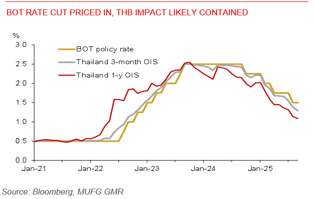 The spotlight next week falls on the upcoming monetary policy decisions from the Bank of Thailand (BoT) and the Bangko Sentral ng Pilipinas (BSP). We expect the BoT to deliver a 25bps rate cut, bringing the benchmark rate down to 1.25%, while the BSP is likely to hold its borrowing rate steady at 5.00%.