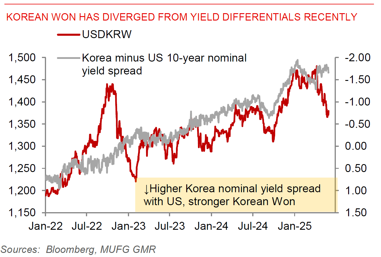 From a macro and markets perspective, we still think the dominant factor for KRW will be the negative impact of tariffs and also the underlying structural weakness of South Korea’s economy including its soft property market and weak domestic demand. As such, we are neutral on KRW and forecast USD/KRW at 1400 by 1Q2026 (see KRW – will it catch up to TWD’s recent gain).