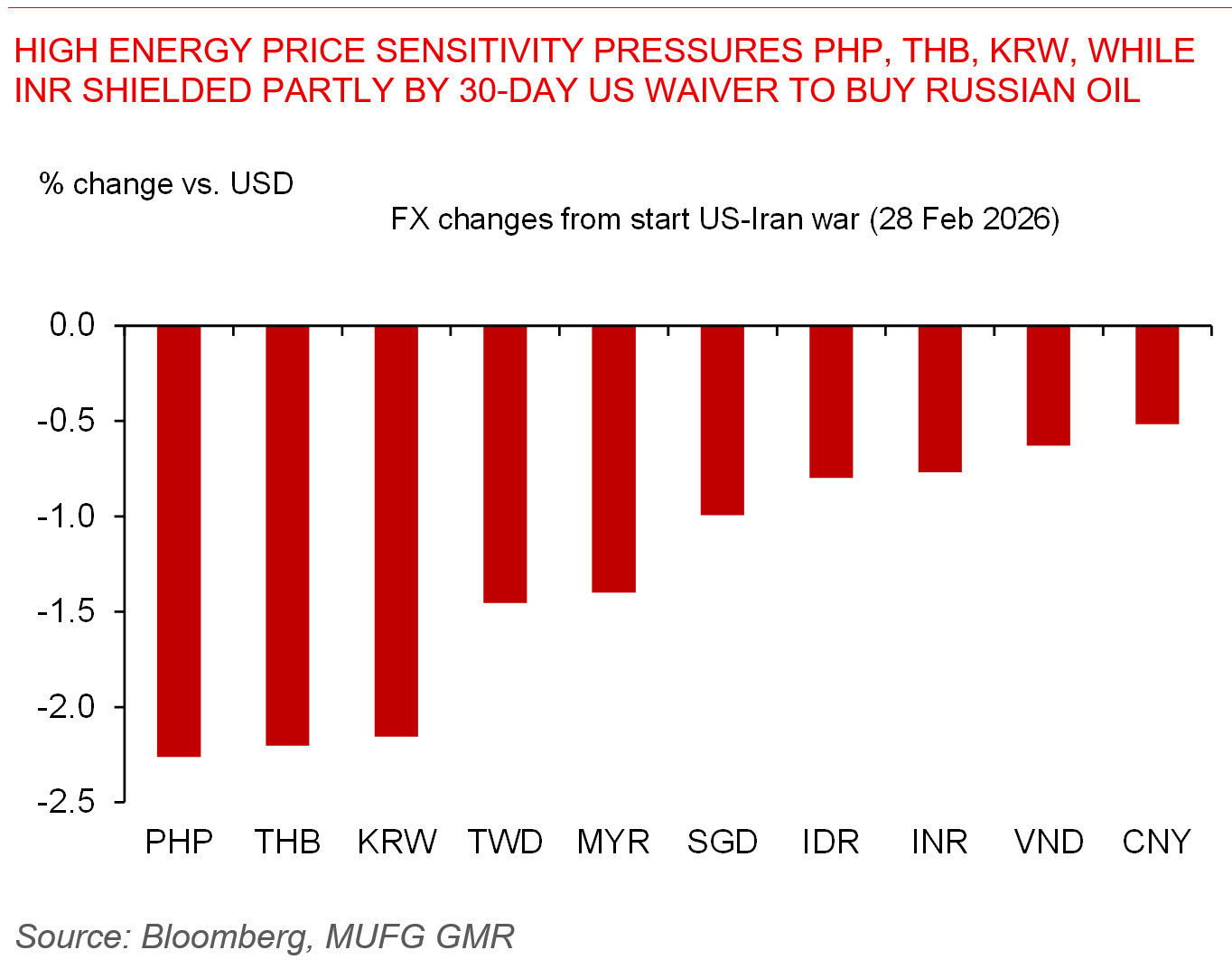 High energy price sensitivity pressures PHP, THB, KRW, while INR shielded partly by 30-day US waiver to buy Russian oil