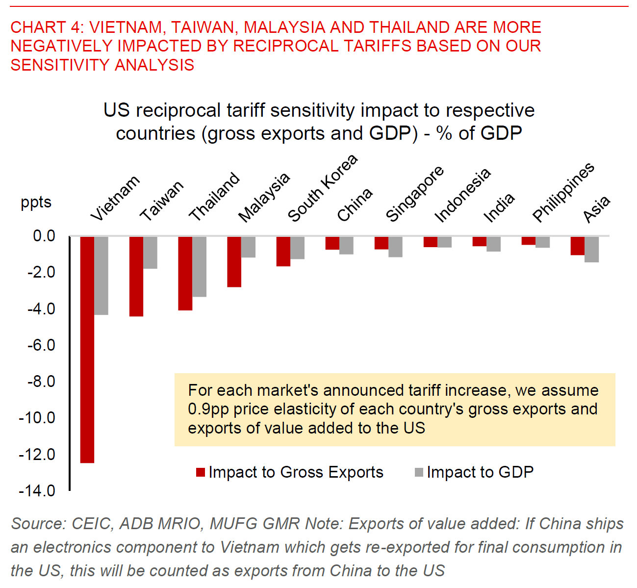- Vietnam, Taiwan, Thailand, Malaysia and Singapore are likely more vulnerable from reciprocal tariffs, while India and the Philippines are relatively more insulated. For example, Vietnam could see a very sharp 12pp reduction in gross exports to the US as a share of its GDP, and potentially up to 4pp reduction in its GDP.