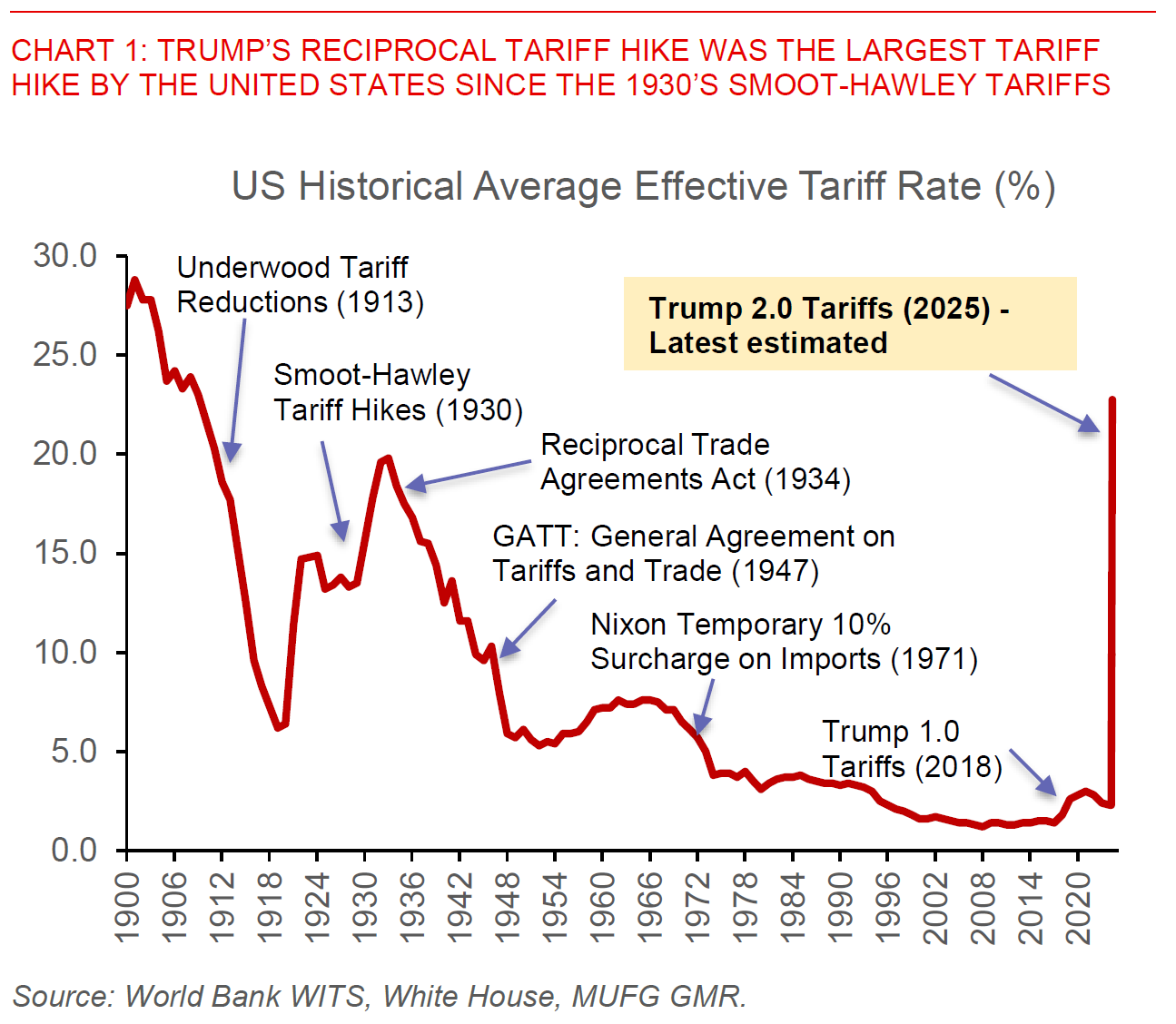 - A 25.1% average US tariffs on its imports is implied by these reciprocal tariffs, the highest tariffs rate since Smoot Hawley Act of 1930.