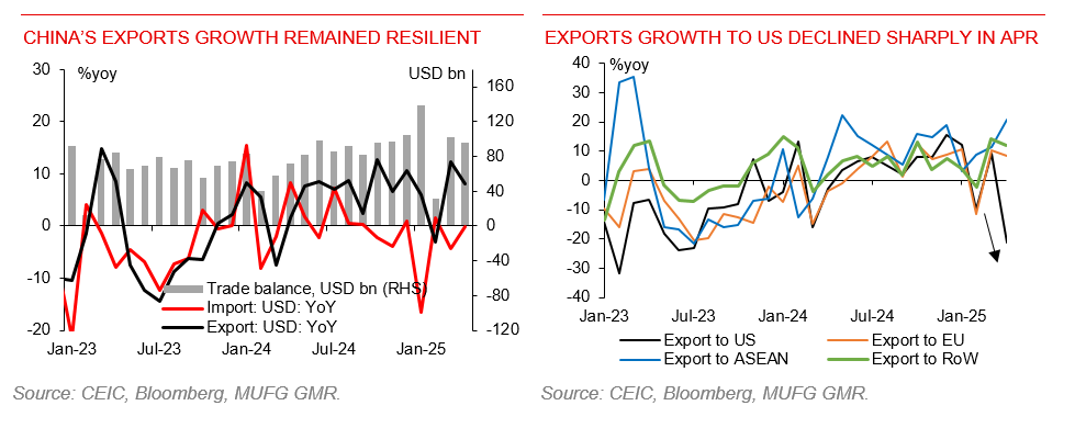 - Impact of US’s tariffs on China was evident. China’s exports to the US fell by 21%yoy in April, compared with a 9%yoy rise in March.