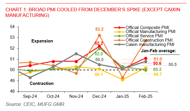 Broad PMI cooled from December's spike (except Caixin manufacturing)