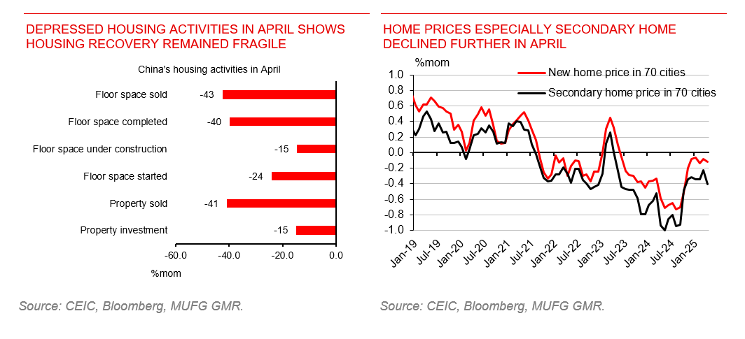 In year-over-year term, the growth slowdown was seen across primary (-2.8ppts), secondary (-0.2ppts) and tertiary industries (-0.3ppts). In particular, manufacturing IP growth decelerated by 0.3ppts to 8.8%yoy, within which the transport equipment sector (e.g., rail, ship, aircraft) experienced a significant growth declaration of 8.3ppts to 29.6%yoy. The sharp growth decline in the sector may be linked to Trump administration’s proposed tariffs targeting China’s maritime, logistics and shipbuilding sectors announced on 17 April (link). Lastly, we saw infrastructure sustaining its YTD growth of 5.8% from prior month, providing some support for overall FAI growth.