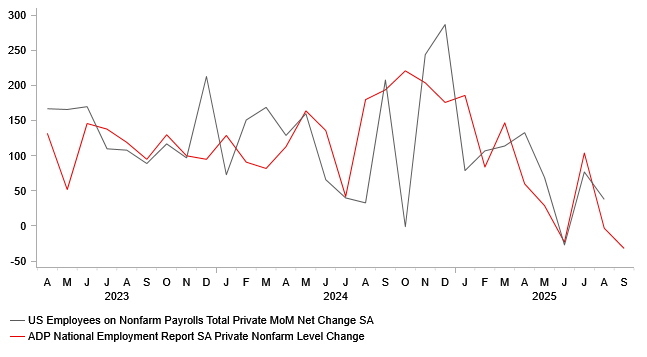 The release of the ADP survey yesterday had more market impact than normal given that the nonfarm payrolls report for September is likely to be delayed due to the government shutdown which will limit further insights into the health of the US labour market. In recent months the ADP survey has provided a closer estimate of nonfarm private employment growth overestimating by an average of around 19k in July and August. Overall, the current estimate for September of -32k does suggest that employment growth remined weak even if the ADP survey is not always the most reliable forward indicator.
