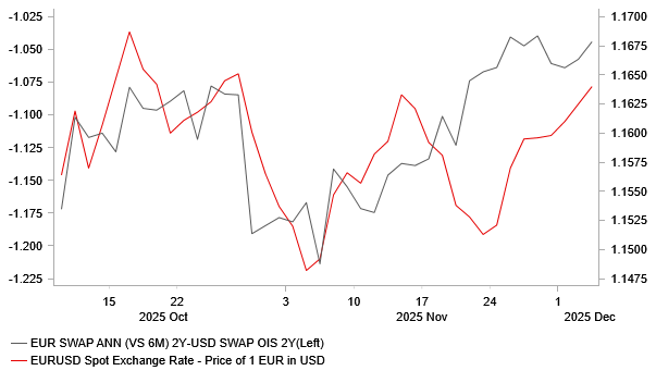 Market expectations for the ECB to leave rates on hold going forward were encouraged yesterday by the release of the stronger than expected euro-zone CPI report for November. The report revealed that headline inflation picked up by 0.1 point to 2.2% in November. The pick-up in headline inflation was driven by the energy component while core inflation remained unchanged at 2.4%. However, the details of the report also revealed a pick-up in services inflation to 3.5% up from 3.4% in October. It was the strongest services inflation print since April 2025 adding to evidence that disinflation in the services sector has stalled since the summer. The report casts some doubt on whether inflation will continue to slow as we expect in the year ahead, and undershoot the ECB’s target. Back in September, the ECB was expecting headline and core inflation of 2.0% and 2.2% in Q4. Recent data point to a slightly higher starting point for the next update of the ECB staff projections. Firmer inflation and stronger than expected growth in Q3 when real GDP expanded by 0.2% should make the ECB more confident policy is currently in the right place. We are still holding on to our call for one final 25bps ECB rate cut next year encouraged by inflation undershooting its target, but acknowledge the building risk that the low point for ECB rates may already be in place. Nevertheless, we expect the Fed to be more active in cutting rates going forward compared to the ECB supporting our forecasts for EUR/USD to move above the 1.2000-level in 2026.