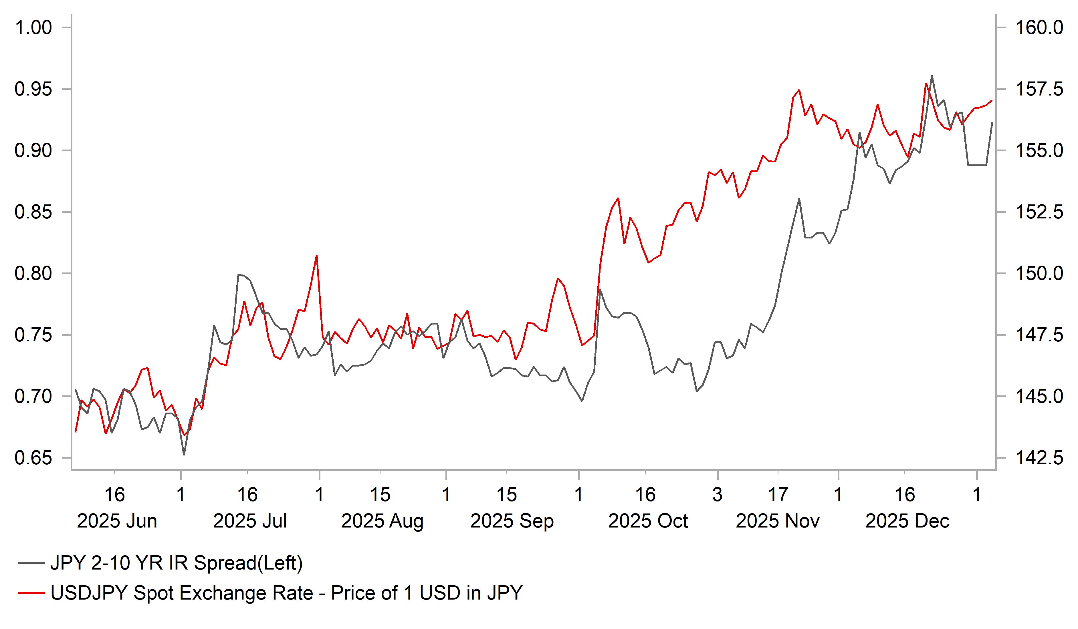 The sell-off in the JGB market has restarted at the start of this week with the 10-year yield hitting a fresh high overnight at 2.13%. It has now risen by around 45-50bps over the last couple of months. The sharp ongoing sell-off continues to reflect concerns over fiscal risks in Japan under Prime Minister Takaichi, and the hawkish repricing of BoJ rate hike expectations. Over the same period the 2-year JGB yield has increased by around 25-30bps which is more closely linked to BoJ rate hike expectations. It has jumped higher by almost 10bps over the last couple of trading days as market participants move to price in more active tightening from the BoJ. The Japanese rate market is more fully pricing in two further 25bps hikes from the BoJ in 2026 with the next hike expected in June or July. The weak yen and loose fiscal policy will put more pressure on the BoJ to raise rates further this year.