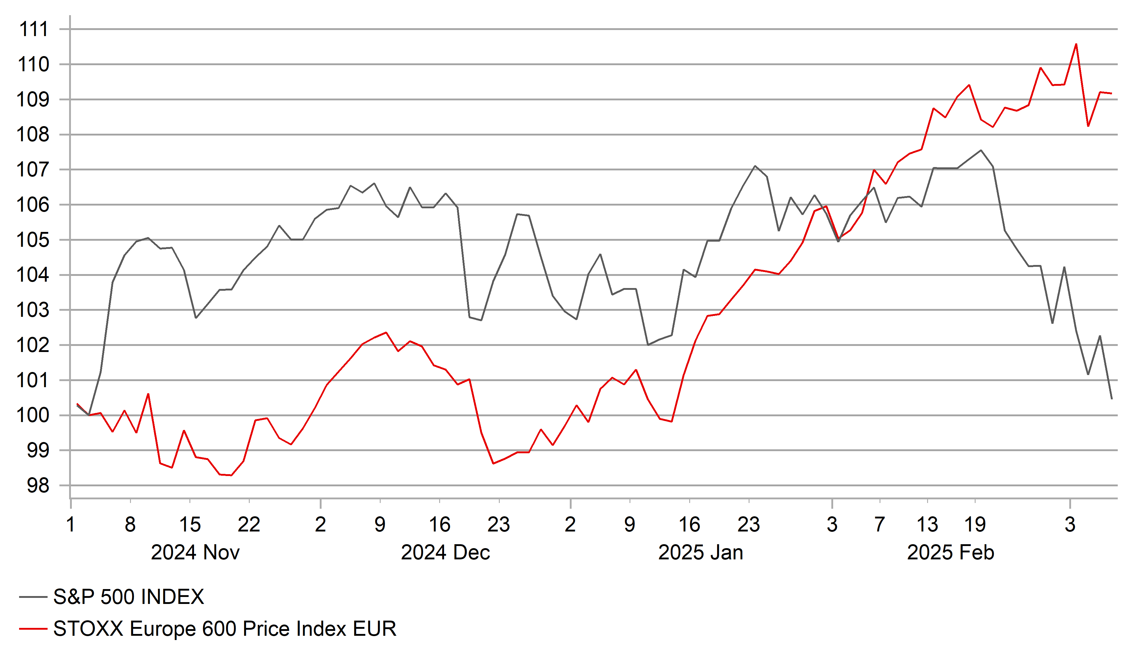 A weaker jobs report today will certainly reinforce fears that the US economy could be headed for a downturn and that the US economy is therefore in no position to weather the wave of tariffs expected in April. Given the scale of shift in rates – the 2yr UST bond yield is 40bps lower since 12th February, the bar is higher for a big reaction to a weaker print. The same can be said in FX. DXY is currently having its largest weekly drop since November 2022 when inflation fears first began to recede following the global inflation shock. But if investors see a deeper downturn as an increased risk this afternoon, then EUR/USD trading closer to 1.1000 is likely.