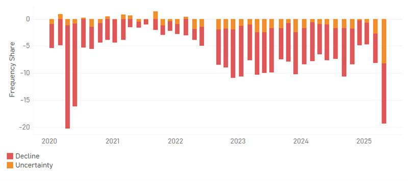 Given the scale of volatility that has taken place since 2nd April when reciprocal tariffs were announced, there is likely to be a shift toward a lack of clear guidance ahead. To provide a clear signal of either a cut or a delay to a cut would create further volatility and could be dangerous given the potential for sudden policy shifts and given the 90-day postponement period for reciprocal tariffs expires on 9th July. If that remains an active date come the next FOMC meeting on 18th June, it may well be difficult for the FOMC to cut rates. The jobs data last week and the full retracement of the S&P 500 back to the level on 2nd April before the tariff announcements has seen pricing for a cut in June drop to just 8bps. A scale of the level of uncertainty was highlighted in the Beige Book published for this meeting. Our own text analysis work revealed the net negative sentiment related to “decline” and “uncertainty” had reached the lowest since the onset of covid in 2020.
