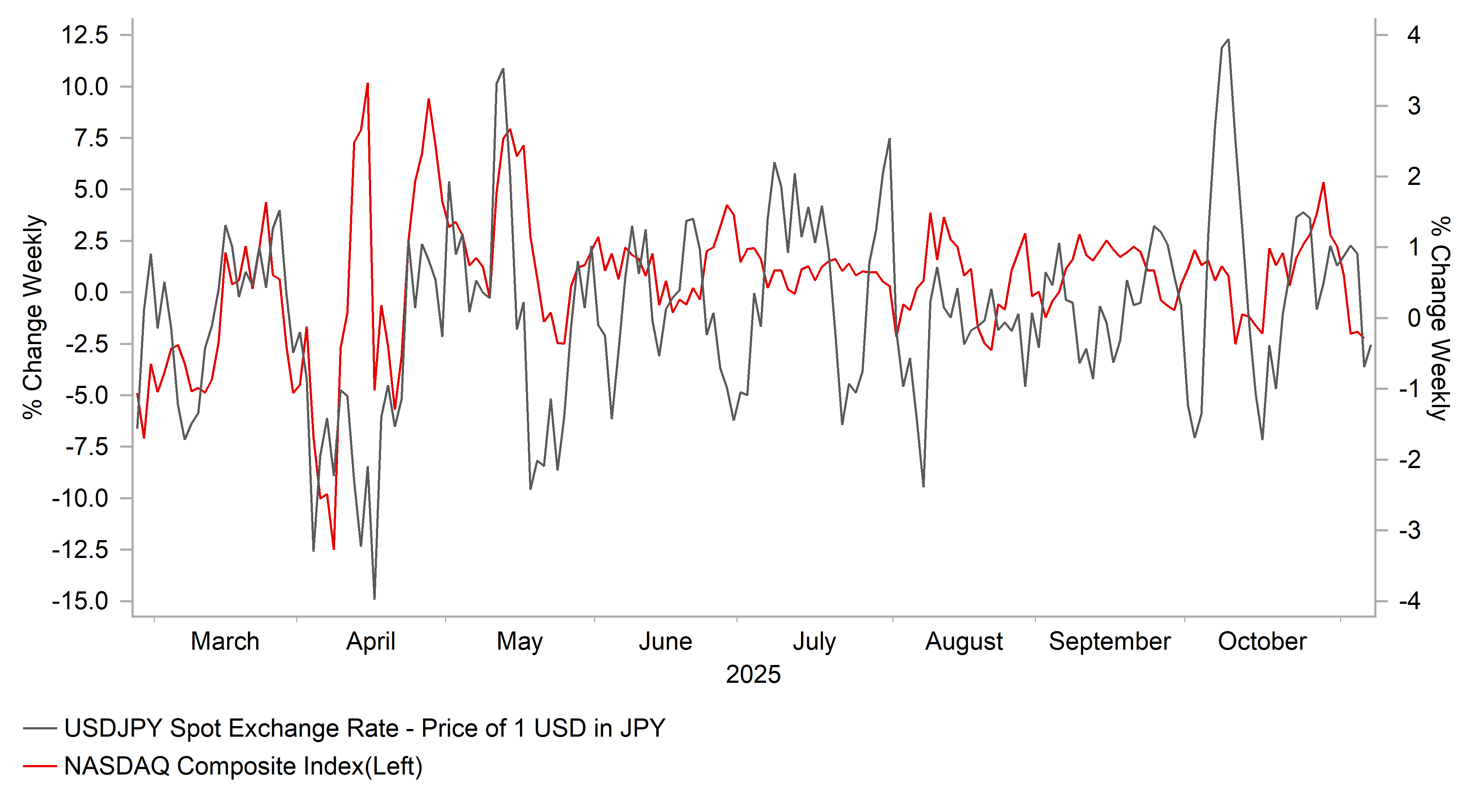 At the same time, the move lower in yields and the US dollar at the end of this week has been driven in part by the sell-off for US AI/tech stocks. The Nasdaq composite index declined by -1.9% yesterday extending it’s correction lower from the peak late last month to just over 4%. It has been the deepest correction lower since April which marked the worst point for risk assets this year triggered by President Trump’s Liberation Day tariffs announcement. The Nasdaq has since staged a sharp rebound rising by around 63% from the low point in April to the high at the end of last month. The deterioration in global investor risk sentiment this week alongside the move lower in global yields has helped the yen to rebound. It is on course to be the best performing G10 currency this week.