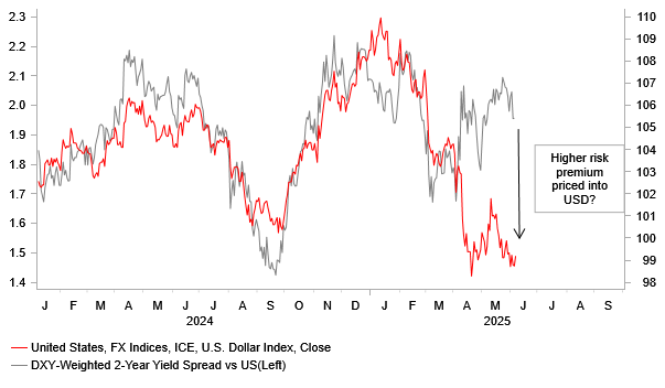 The hawkish repricing was triggered by the nonfarm payrolls report revealing that the US economy added 139k jobs in May although that was offset by further downward revisions to employment growth in prior months totalling -95k. In the first five months of this year the US economy has added on average 124k jobs/month compared to 144k/month in 2024. Employment growth is slowing in response to trade disruption and heightened policy uncertainty but is not yet judged likely to prompt he Fed to resume rate cuts soon. Even as employment growth has been slowing this year, the unemployment rate has continued to remain stable between 4.0% and 4.2% as it has done since the middle of last year indicating that the labour market is not loosening enough to offset upside risks to inflation in the near-term from higher tariffs. Tighter immigration policies at the start of Trump’s second term could be slowing labour supply growth and setting a higher bar for the unemployment rate to rise in the near-term. The tighter immigration policies have also triggered social unrest over the weekend in Los Angeles which could contribute to a further loss of confidence in the US dollar. Overall, we still expect the US labour market to weaken further opening the door for the Fed to resume rate cuts in the 2H of this year and supporting our forecasts for further US dollar weakness (click here). However, it appears more likely that the Fed will wait at least until September to resume rate cuts unless the release of the nonfarm payrolls report for June reveals a much sharper slowdown in employment growth.