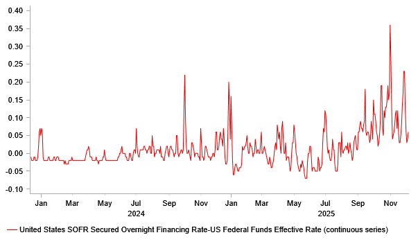 TIGHTENING LIQUIDITY SEEN THROUGH SOFR-FED FUNDS SPREAD VOLATILITY COULD SEE FED TAKE ACTION TONIGHT