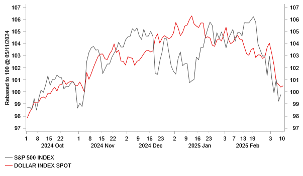 Fed Chair Powell is not yet overly concerned by recent softer US economic data either. He stated on Friday that “despite elevated levels of uncertainty, the US economy continues to be in a good place” and that “ we do not need to be in hurry, and are well positioned to wait for greater clarity”. He added that “it remains to be seen how these developments might affect future spending and investment”. It stands in contrast with the US rate market expectations that have moved to price back in more Fed cuts. The US rate market has recently brought forward the expected timing of the next Fed rate cut to June and a cumulative total of 75bps cuts by the end of this year. Developments that have added to downward pressure on the US dollar in the near-term.