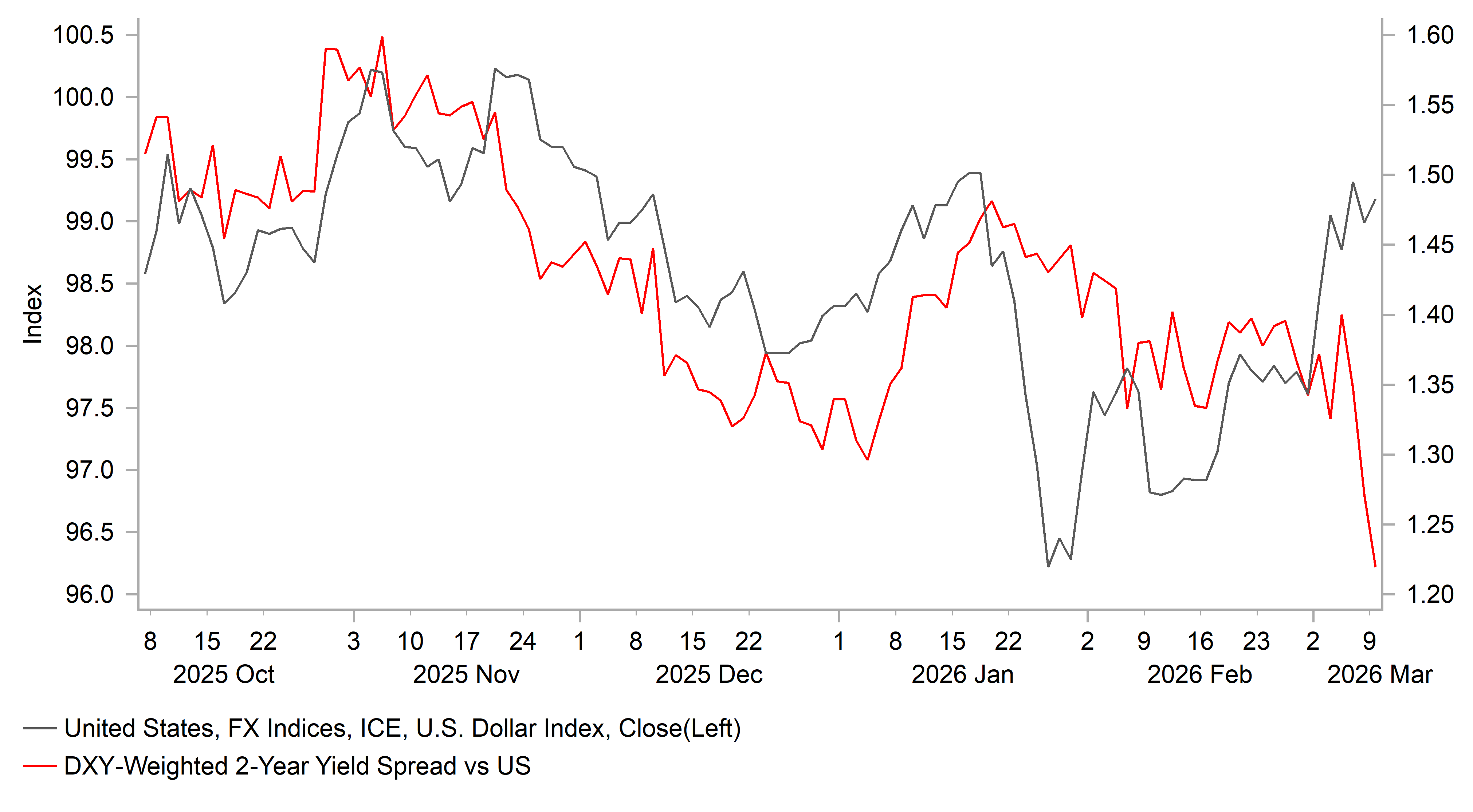 Another factor which has been helping to dampen US dollar strength on the back of the energy price shock has been the recent move in yield spreads. There has been a bigger hawkish repricing in European rate markets than in the US. The 2-year US Treasury yield has increased by around 18bps since the close on 27th February prior to the start of Operation Epic Fury while 2-year government bond yields in the euro area and UK have increased by 25bps and 36bps respectively. Market participants have taken the view that the ECB and BoE will be more sensitive to higher inflation given the policy rate in the euro area is already at neutral and inflation has proven more persistent in the UK. In contrast, the US rate market still expects the Fed to deliver 1-2 rate cuts this year with the Us economy expected to see relatively smaller pick-up in inflation pressures from the energy price shock. Please see our latest FX Weekly for more details (click here).