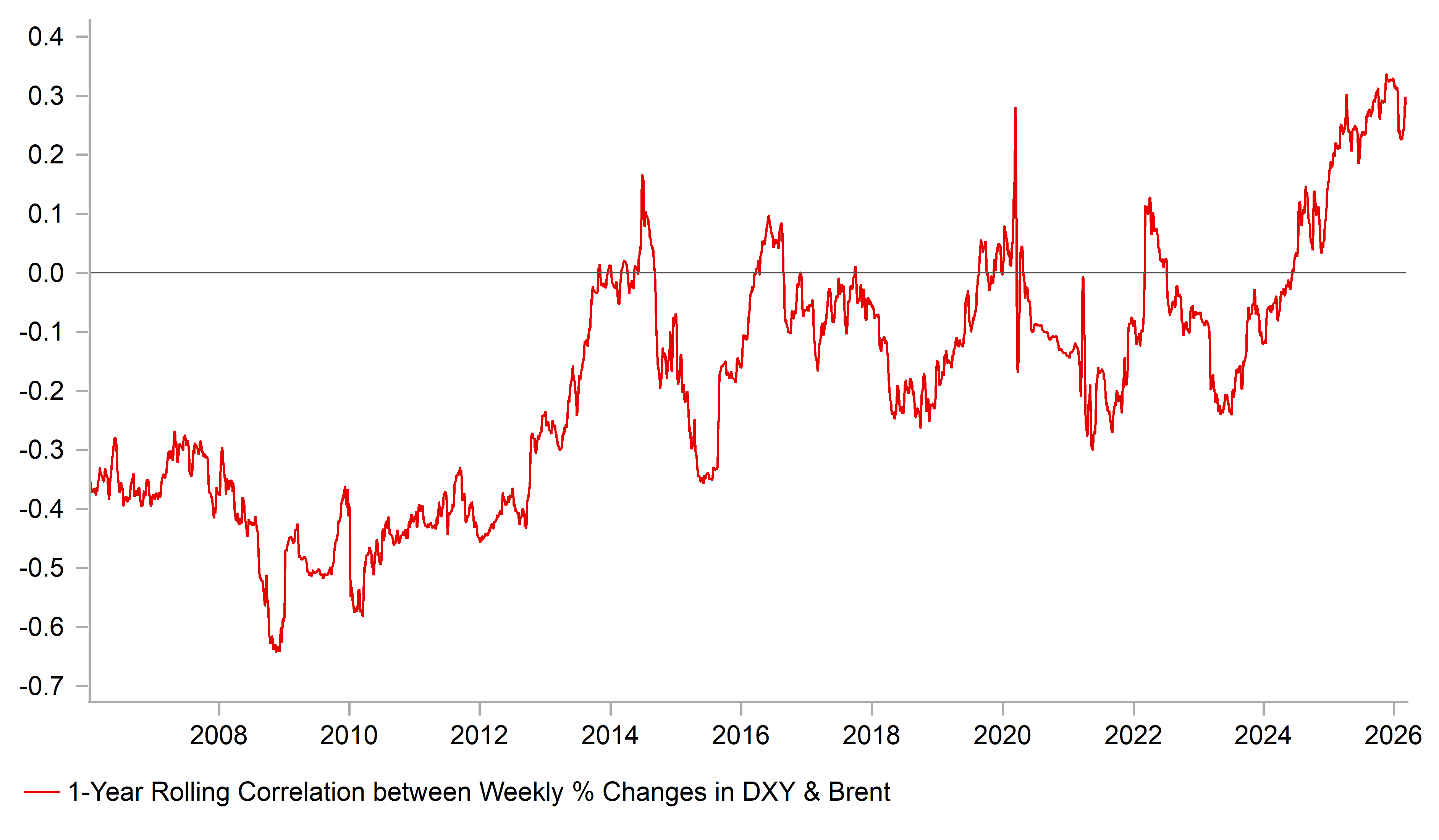 The US dollar has strengthened overnight encouraged by the price of oil moving back above USD100/barrel. The price action continues to highlight that market participants remain concerned over the risk of a bigger and more prolonged negative energy price shock for the global economy. Those concerns have been reinforced overnight by reports that Oman’s key oil export terminal was evacuated and two crude tankers were hit in Iraqi waters. Ships were ordered to leave the port of Mina Al Fahal in Oman as a precautionary measure according to people who directly received a notice from a port agent. It follows drone attacks at other ports in the country on Wednesday. The evacuation at Mina Al Fahal, which sits outside the Strait of Hormuz, highlights how the conflict is now threatening the few ports from which Middle Eastern oil can still be shipped from while the Strait of Hormuz remains effectively closed. According to Bloomberg, around 1 million barrels/day of Omani oil are exported from Mina Al Fahal. The director of the General Company for Ports of Iraq also stated that the country has stopped operations at its oil terminals after two crude tankers were hit in its territorial waters.