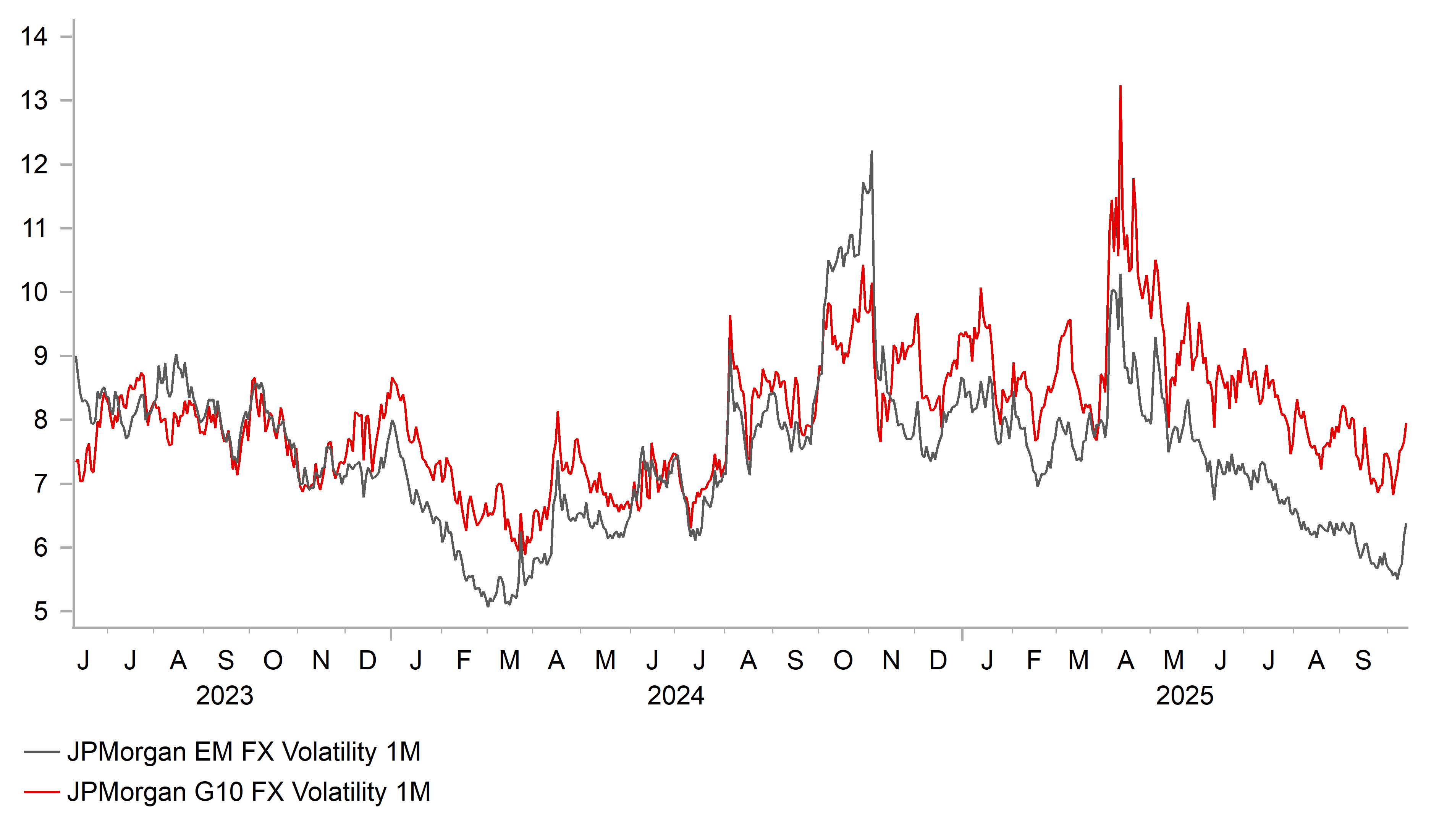 Market participants will be braced for another week of heightened political uncertainty in France. We continue to hold the same views as last week (click here), downside risks for the euro would increase if Prime Minister Lecornu once again proves unsuccessful in reaching an agreement and thereby increases the probability of President Macron calling snap elections before year end. Alternatively, the best outcome for the euro would if a budget agreement can be reached.