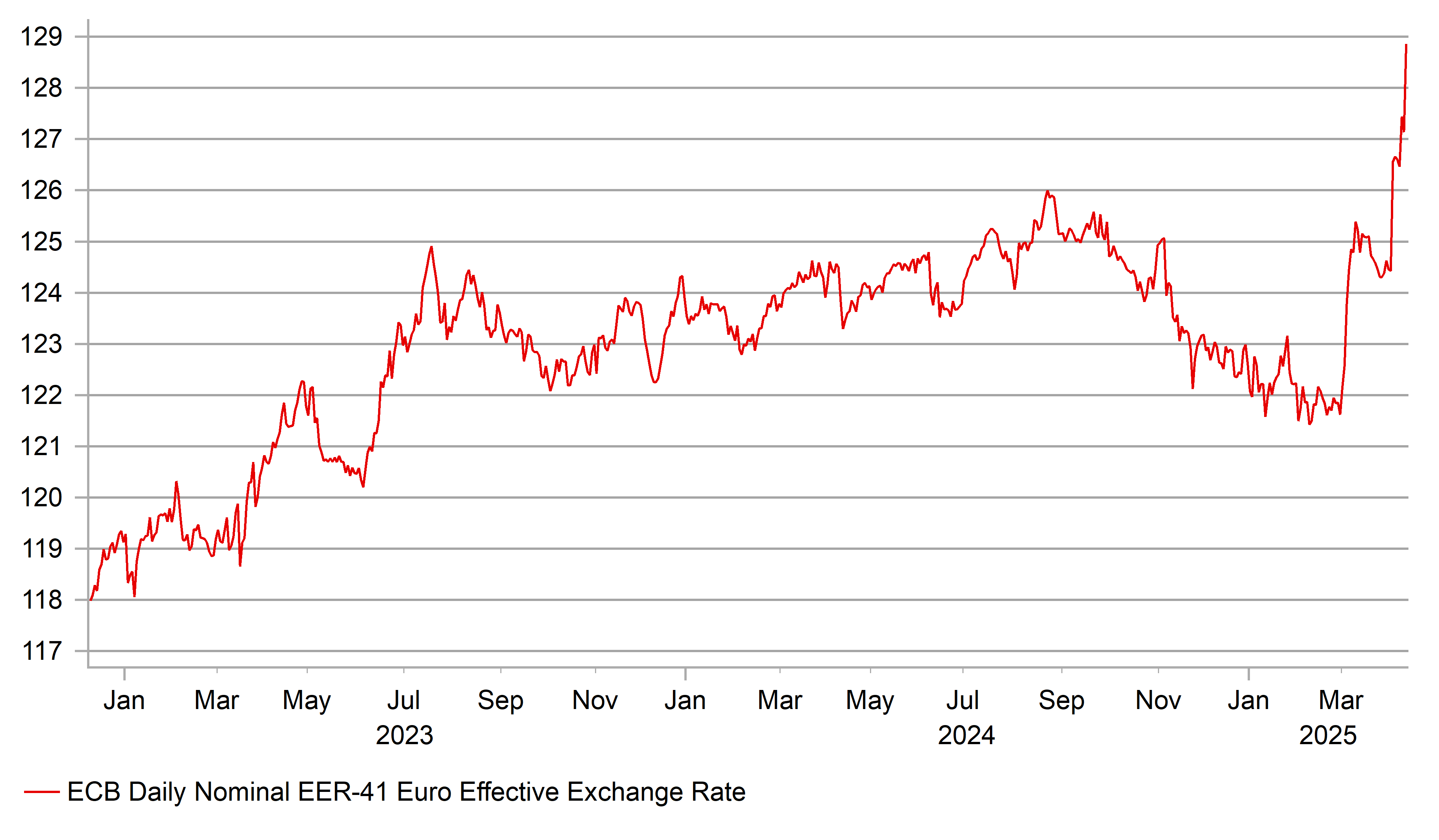 Prior to Trump’s actions, we assumed the ECB would cut to 2.00% but now we are adding one further rate cut to 1.75% with risks of the ECB having to cut further. FX moves since the tariff turmoil make a rate cut this week an easier decision. The technical assumptions used in the forecasts by the ECB in March, based on market conditions before the turmoil had the EER EUR-41 Index at 122.2 through the 2025-2027 period. The EER EUR-41 Index is now trading just below 129.0, a huge 5.5% advance relative to the forecast profile. That alone has the potential to lower the inflation estimate at the end of the forecast profile by between 0.1-0.2ppt leaving the inflation forecasts below the 2.0% target level. An ECB rate cut is fully priced so how Lagarde communicates on the scope for more cuts will be key for rates markets.
