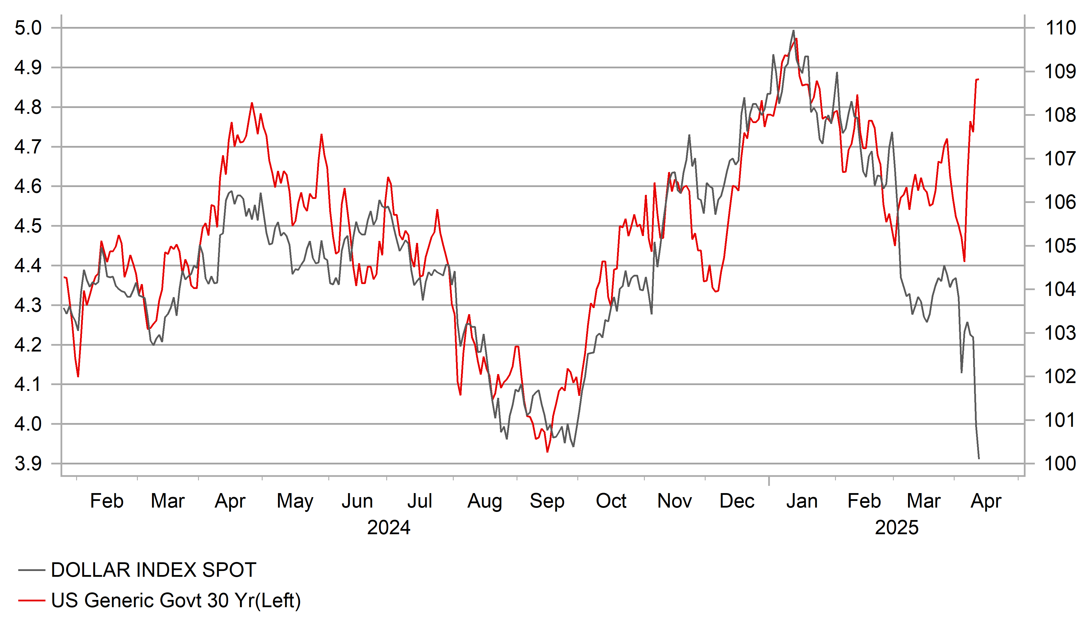 UST 30-YEAR HAS JUMPED BACK CLOSE TO THE HIGHS SEEN IN JANUARY WHILE THE DXY INDEX HAS PLUNGED TO LEVELS NOT SEEN SINCE 2022