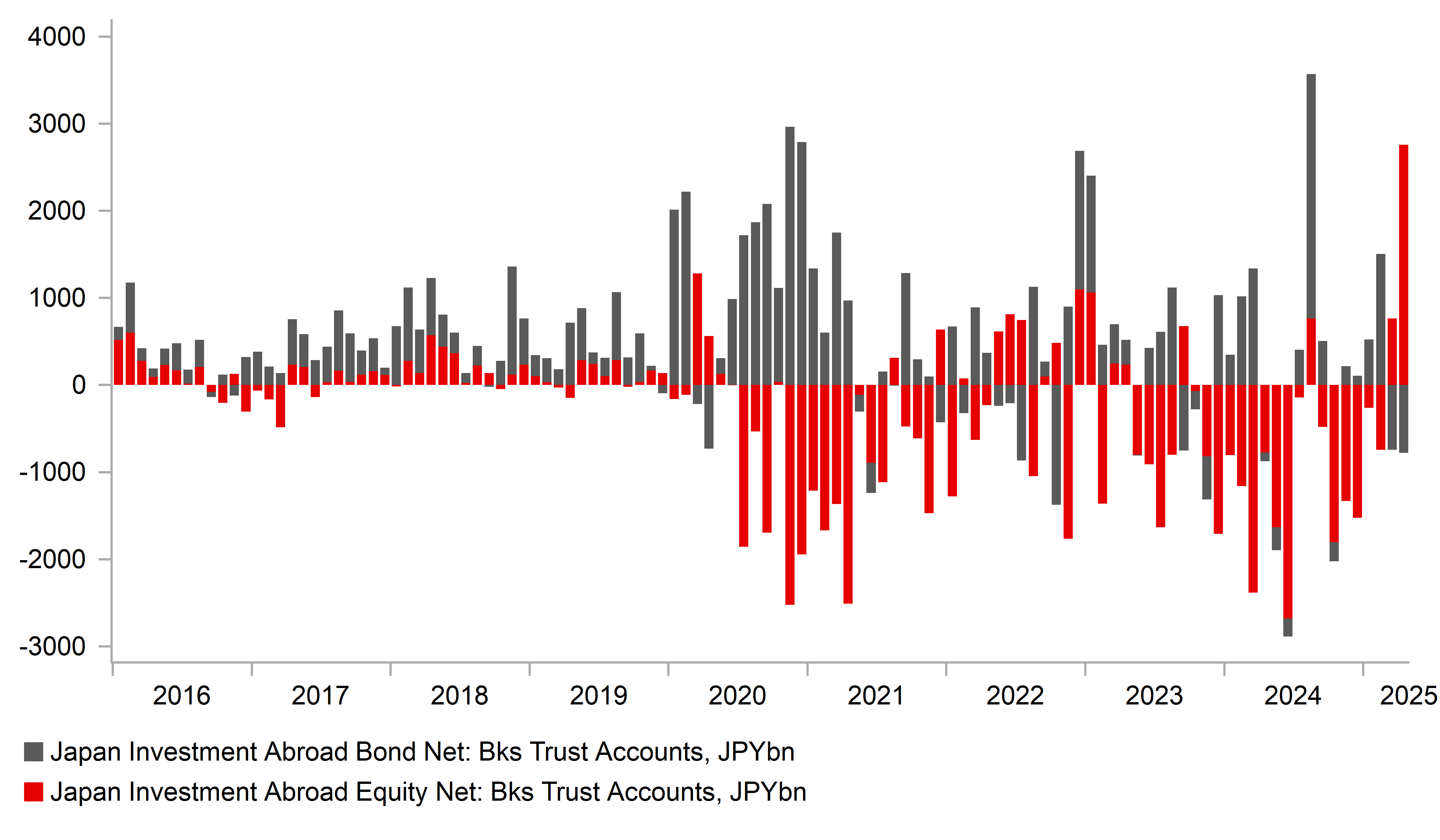 But monthly International Transactions in Securities data from the MoF, released on Monday was revealing in highlighting another flow that looks to have helped fuel the sharp rebound in USD/JPY. It looks like certain Japanese investors may have seen an opportunity for buying foreign securities at more opportunistic levels – both foreign equities and FX. The data for all Japanese investors revealed purchases of foreign equities totalling JPY 3,272bn in April – that’s a record total in a data series going back to 2001. The data series also breaks down the monthly flow by investor type and hence we can see that it was Japan Trusts that were the active buyers of foreign equities, buying JPY 2,762bn. As the chart above shows, this is an off-the-charts record total in the data series back to the start of 2005.
