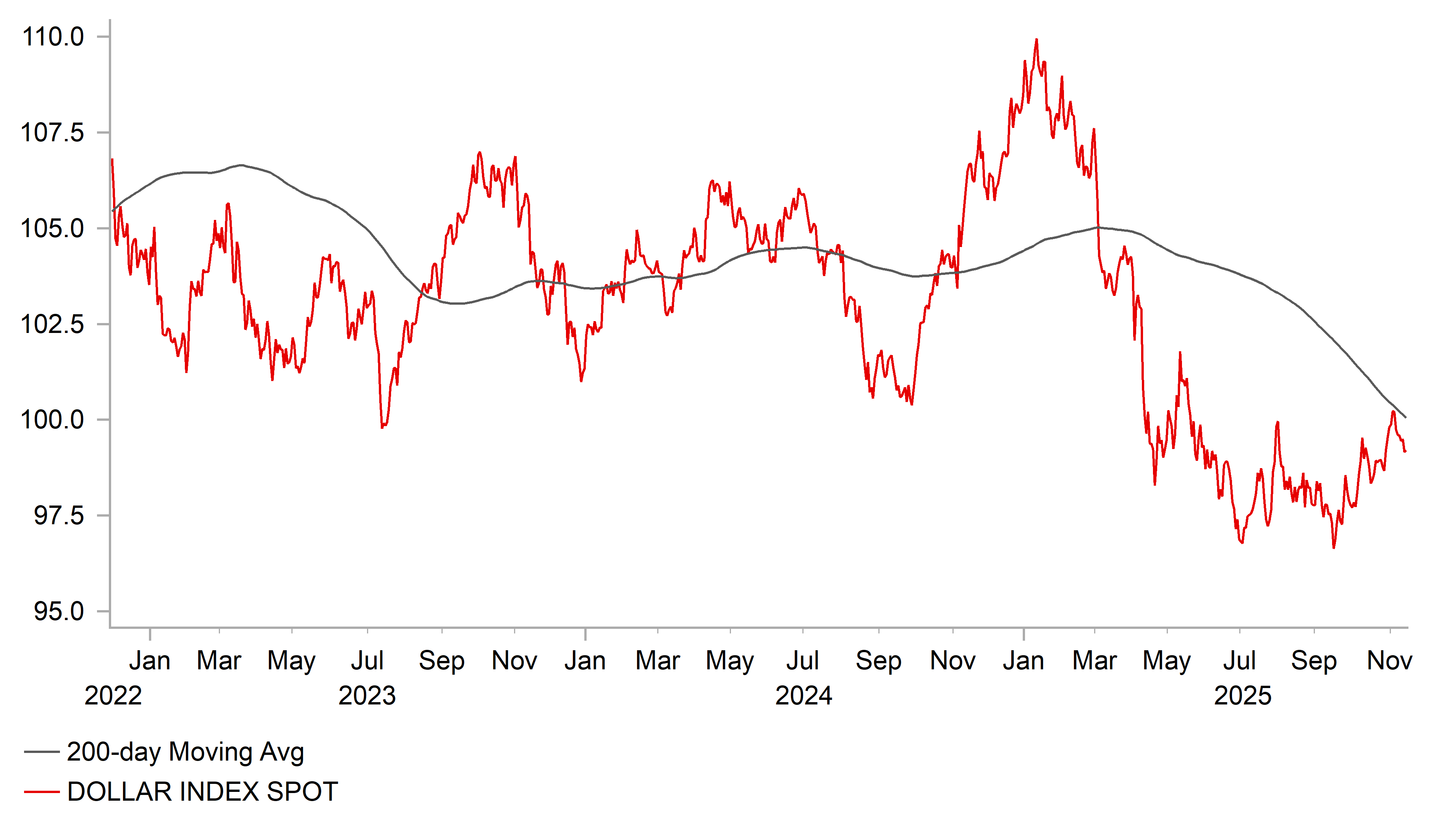 The US dollar has weakened this week even as the US rate market has moved to scale back expectations for Fed rate cuts. The US rate market is currently pricing in around 13bps of cuts by the December FOMC meeting down from around 17bps a week ago. It highlights that the December FOMC decision is now judged as more of a toss up over whether the Fed decides to lower rates for the third consecutive meeting. Comments from Fed officials over the past week have highlighted opposition to another rate cut as soon as next month. Boston Fed President Susan Collins, who votes on the FOMC this year, stated this week that “it will likely be appropriate to keep the policy rates at the current level for some time to balance the inflation and employment risks in this highly uncertain environment”. After Kansas City Fed President Schmid dissented last month to keep rates on hold, it appears likely there will be more hawkish dissents in December if rates are cut again. Our forecast for another cut in December is built on the assumption that the Fed will continue to prioritize weakness in the labour market when setting policy. We expect the delayed releases of NFP reports for September and October to tip the balance in favour of another cut. National Economic Council Director Kevin Hassett stated yesterday that the October NFP report will be released but without the household survey which includes the unemployment rate. He also added it was possible the September NFP report will be released next week although an exact date has not yet been confirmed.