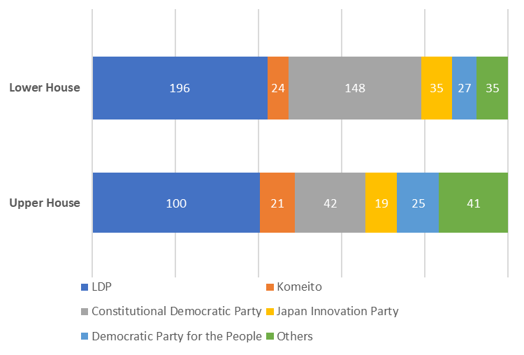 BREAKDOWN OF SEATS IN BOTH HOUSES OF THE DIET