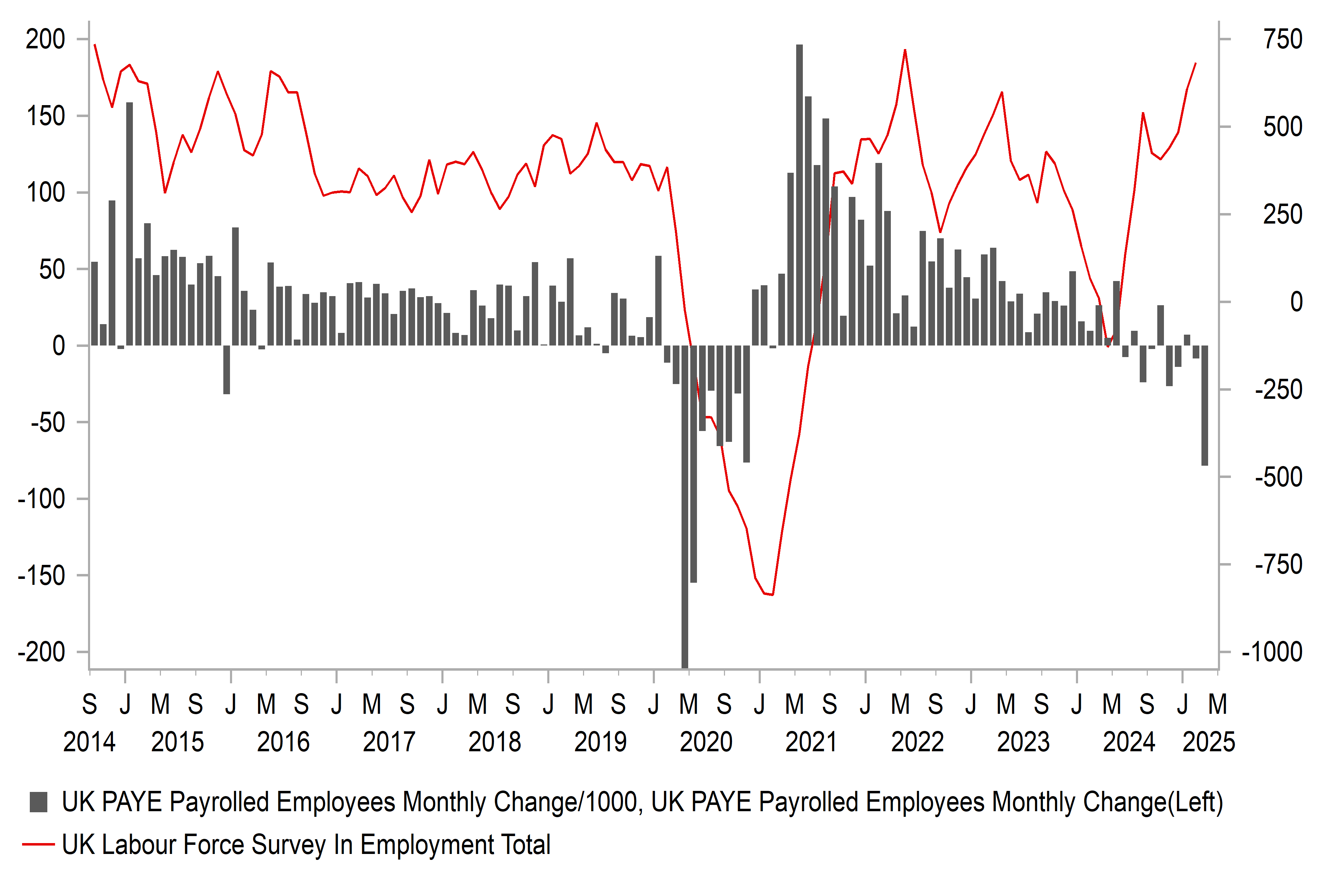 Still, there remains justification for a continued gradual approach to monetary easing and we see the data as still consistent with a quarterly pace of 25bp cuts to Bank Rate. The BoE has already indicated that it is placing more importance on labour market survey data given unreliability of the official data. The ILO unemployment rate remained at 4.4% with employment increasing 206k on a 3mth/3mth basis. Once again, the PAYE jobs data was much weaker with a drop of 78k in March after a decline of 8k in February (revised from +21k). The March drop was the largest since the covid turmoil in early 2020. In addition, the latest Recruitment & Employment Confederation survey data for March revealed the biggest increase in availability of workers since the pandemic in December 2020. The minimum wage increase this month, the NICs increase for employers and Trump trade policy uncertainties all contributed to the increased caution.