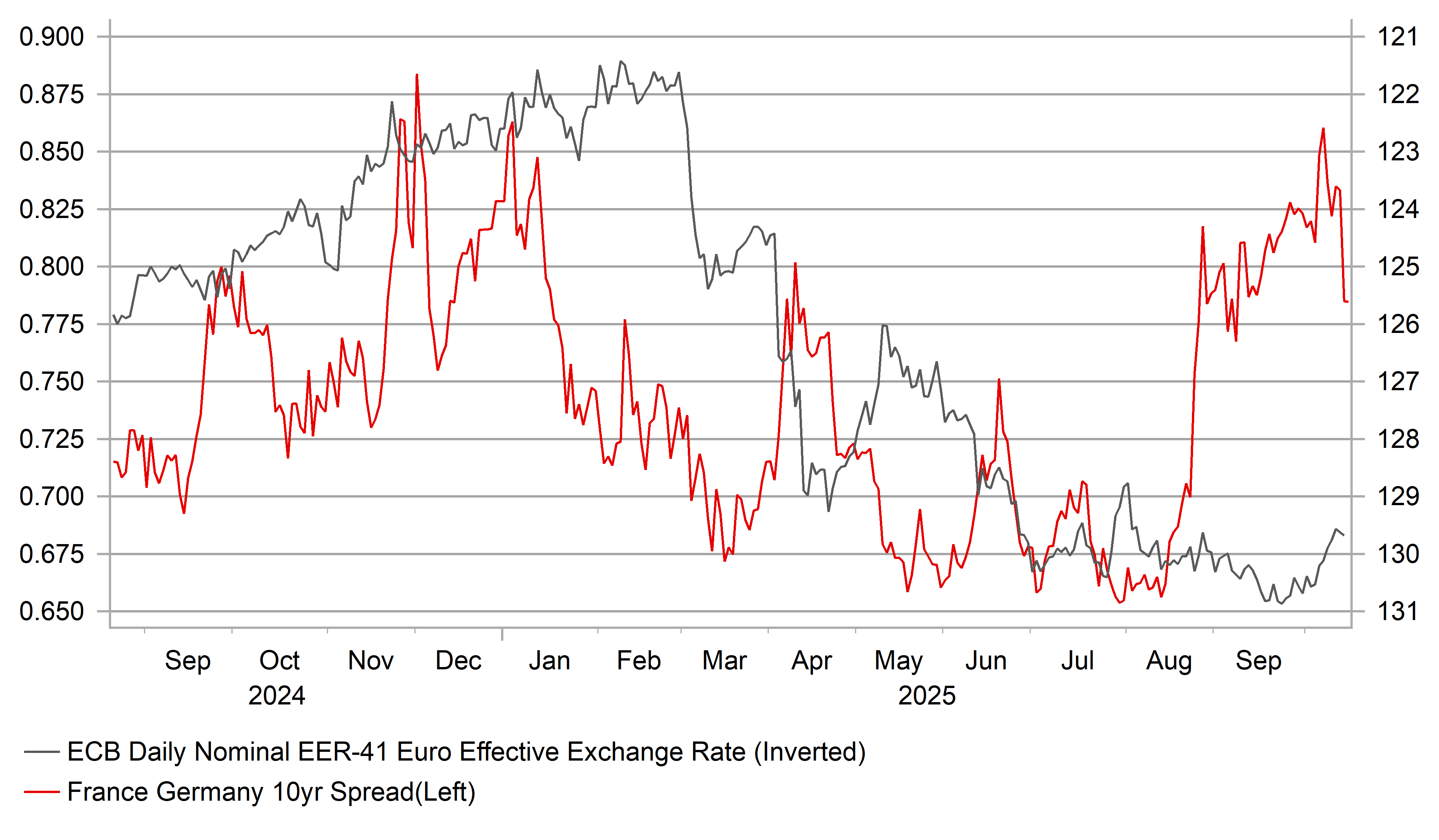 So while we believe there was some cherry-picking of the jobs data yesterday, we concur with the overall direction of the rates move given we see scope for the BoE to be in a position to cut in December. We also had comments from MPC member Alan Taylor yesterday – a known dove, who voted with Swati Dhingra to cut rates in September, his comments nonetheless came across as more confident in believing that the economy needs further monetary easing. Taylor’s speech was on trade diversion and one conclusion was that trade diversion on a “material scale” would likely have “substantial bearing on prices” in the UK. China exports to the UK in September data released this week revealed a 12.2% YoY increase. Exports to the US fell 27%. Taylor and Swati remain the lone doves on the MPC for now but assuming inflation slows in October/November data and wages do not rebound, the justification for a rate cut will likely grow. We maintain our view of a gradual increase in EUR/GBP into year-end as market positioning for a BoE rate cut increases. Long EUR/GBP remains a trade view published in our FX Weekly publication.
