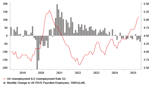The release today of the latest UK labour market report provided further evidence of loosening labour market conditions. Payrolled employees fell by -38k in November. It was the largest monthly decline this year and takes the year to date drop to almost -154k. Loosening labour market conditions were also highlighted by the ongoing rise in the unemployment rate to a new cyclical high of 5.1%.  It has risen by 1.0 percentage point in just over a year. Loosening labour market conditions and softening inflation are helping to slow wage growth. Private sector wage growth excluding the more volatile bonus component slowed to 3.9% 3M/YoY in October down from 4.2% in September, although it was a little higher than the consensus forecast. It has been trending lower since the end of last year when it was at 6.2% in December 2024.