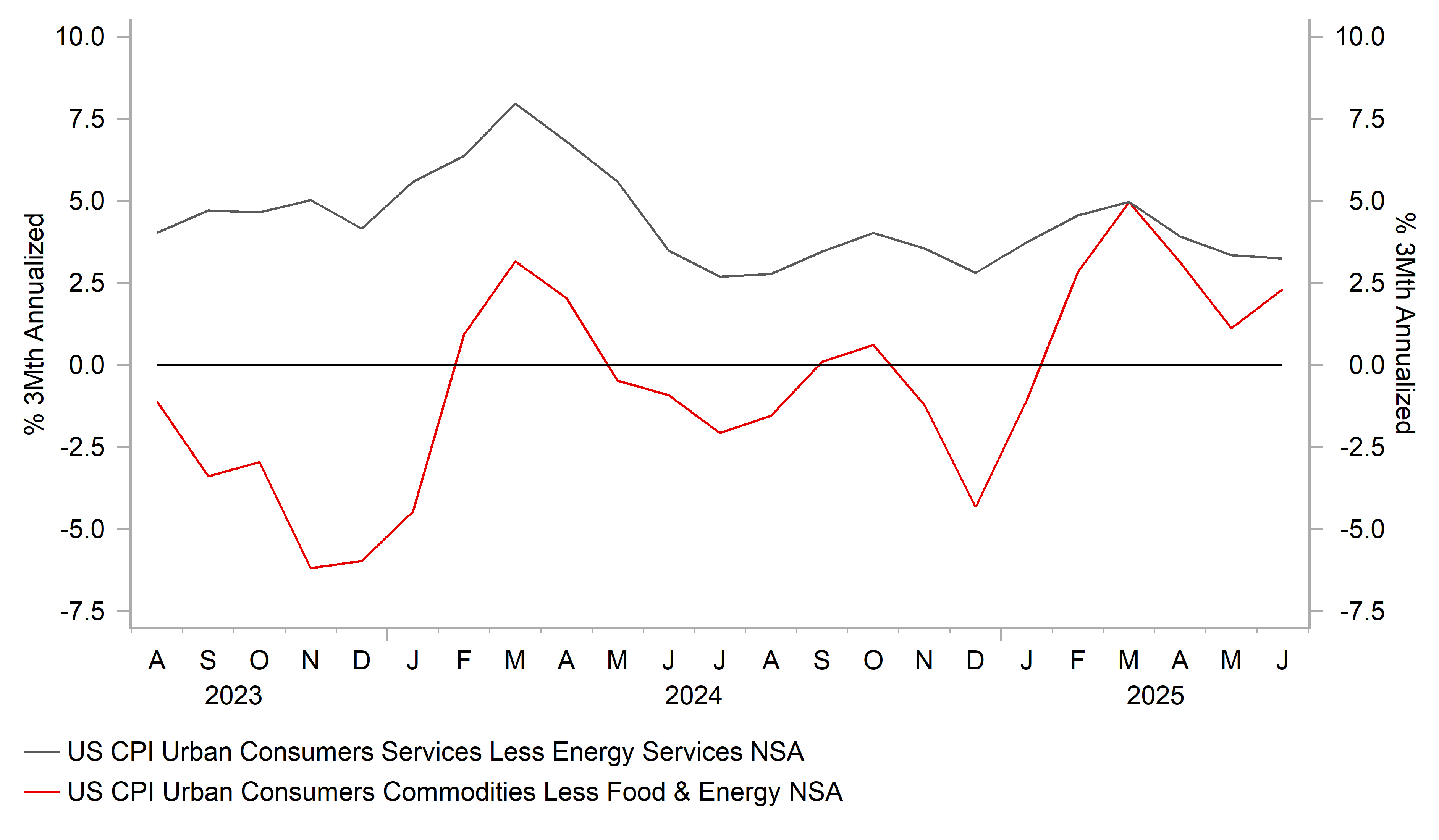 The US dollar has continued to trade at stronger levels after extending its recent rebound yesterday following the release of the latest US CPI report for June. US dollar gains have been most evident against the yen amongst the FX majors lifting USD/JPY back above up above the 149.00-level as it moves closer to the 150.00-level ahead of this weekend’s Upper House election in Japan. The US dollar has strengthened despite the fifth consecutive monthly downside surprise for core inflation which increased by 0.23%M/M in June coming in below the Bloomberg consensus forecast of 0.3%M/M. Instead market participants have focused more on evidence in the CPI report showing that higher tariffs are beginning to lift goods prices. Core goods prices excluding autos increased by +0.5%M/M in June which was the biggest monthly increase in three years. Unsurprisingly the biggest price increases were for goods that are mainly imported such as appliance prices which jumped by 1.9%M/M, sports equipment prices up 1.8%M/M, toy prices up 1.8%M/M and video & audio product prices up 1.1%M/M. The inflationary impact of tariffs is expected to increase further in in next month’s CPI report for July. The outlook for inflation beyond is more uncertain as we wait to see whether President Trump will follow through on plans to impose higher “reciprocal” tariffs from 1st August. In contrast, core services inflation remained more modest increasing by +0.25%M/M in June. Fed Chair Powell’s favourite measure of core services inflation excluding shelter similarly increased by +0.21%M/M. It is too early to expect higher prices from tariffs to feed through significantly into service sector inflation. There was also good news showing that shelter inflation continued to slowdown meaningfully increasing by just +0.18%M/M.