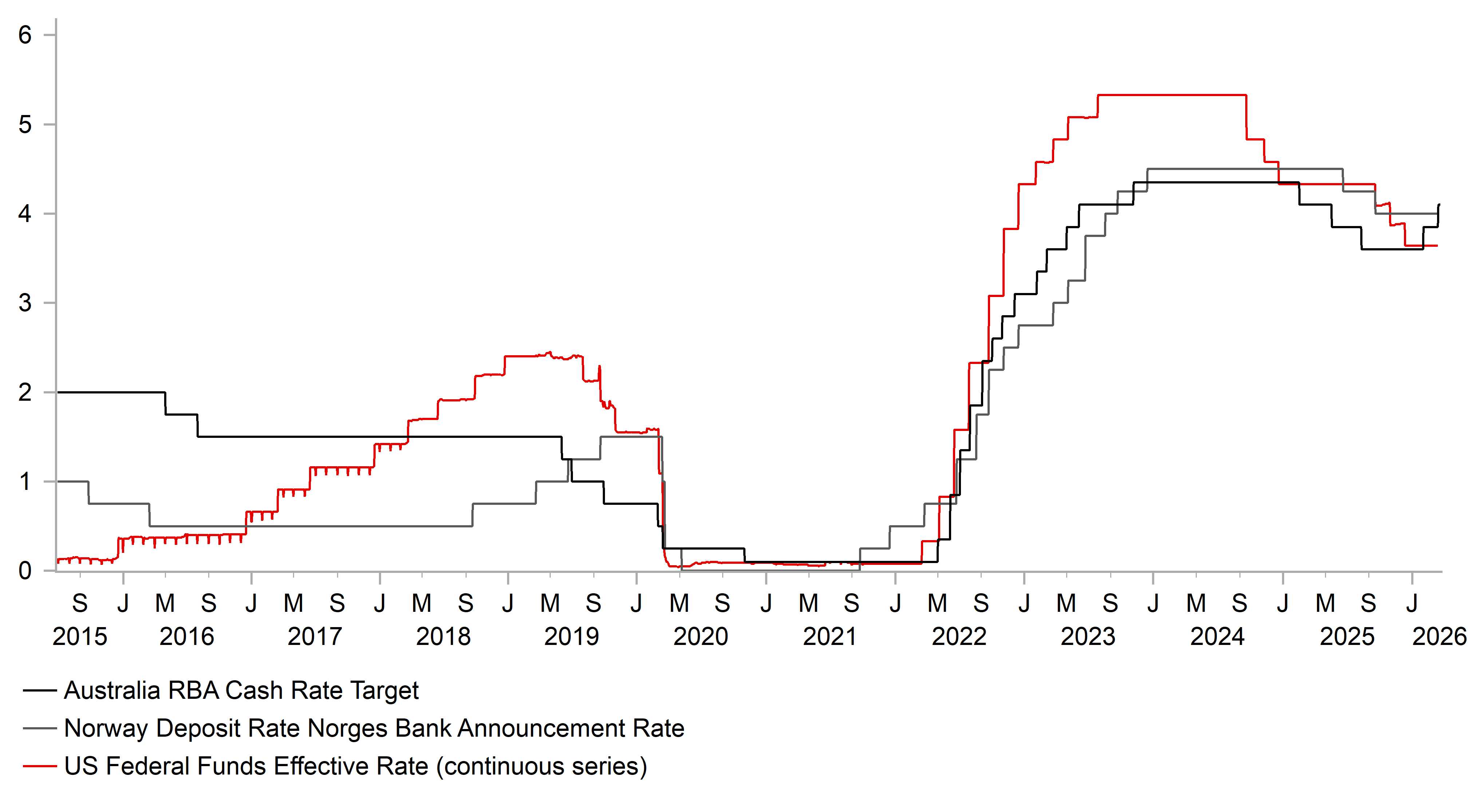 Today’s decision to raise rates reflected the RBA’s judgement that “there is a material risk that inflation will remain above target for longer than previously anticipated”. Information since February suggested that some of the increase in inflation reflects greater capacity pressures due in part to greater momentum in demand in the latter part of 2025. Growth in private demand strengthened substantially more than was expected in the middle of last year. The RBA also acknowledged that that the conflict in the Middle East has resulted in sharply higher fuel prices, which, “if sustained, will add to inflation”. At the same time, the RBA acknowledged that the conflict in the Middle East poses substantial risks in both directions. “A longer or more severe conflict could put further upward pressure on global energy prices” pushing up near-term inflation and also increase inflation further out if it impairs supply capacity or price rises get built into longer-term inflation expectations”. However, “higher prices and prolonged uncertainty may also cause growth to be lower in major trading partners and in Australia”. In the press conference, Governor Bullock stated that higher fuel prices were not the reason for today’s rate hike but the Middle East conflict has heightened concerns about ongoing inflation. Overall, the hawkish comments relating to inflation risks from the conflict support market expectations for two further hikes this year. Rising yields in Australia remain a tailwind for the Aussie alongside higher commodity prices which have both helped it to outperform this year. The energy price shock would have to deliver a bigger negative global growth shock and deeper risk asset correction to trigger a reversal of Aussie strength.