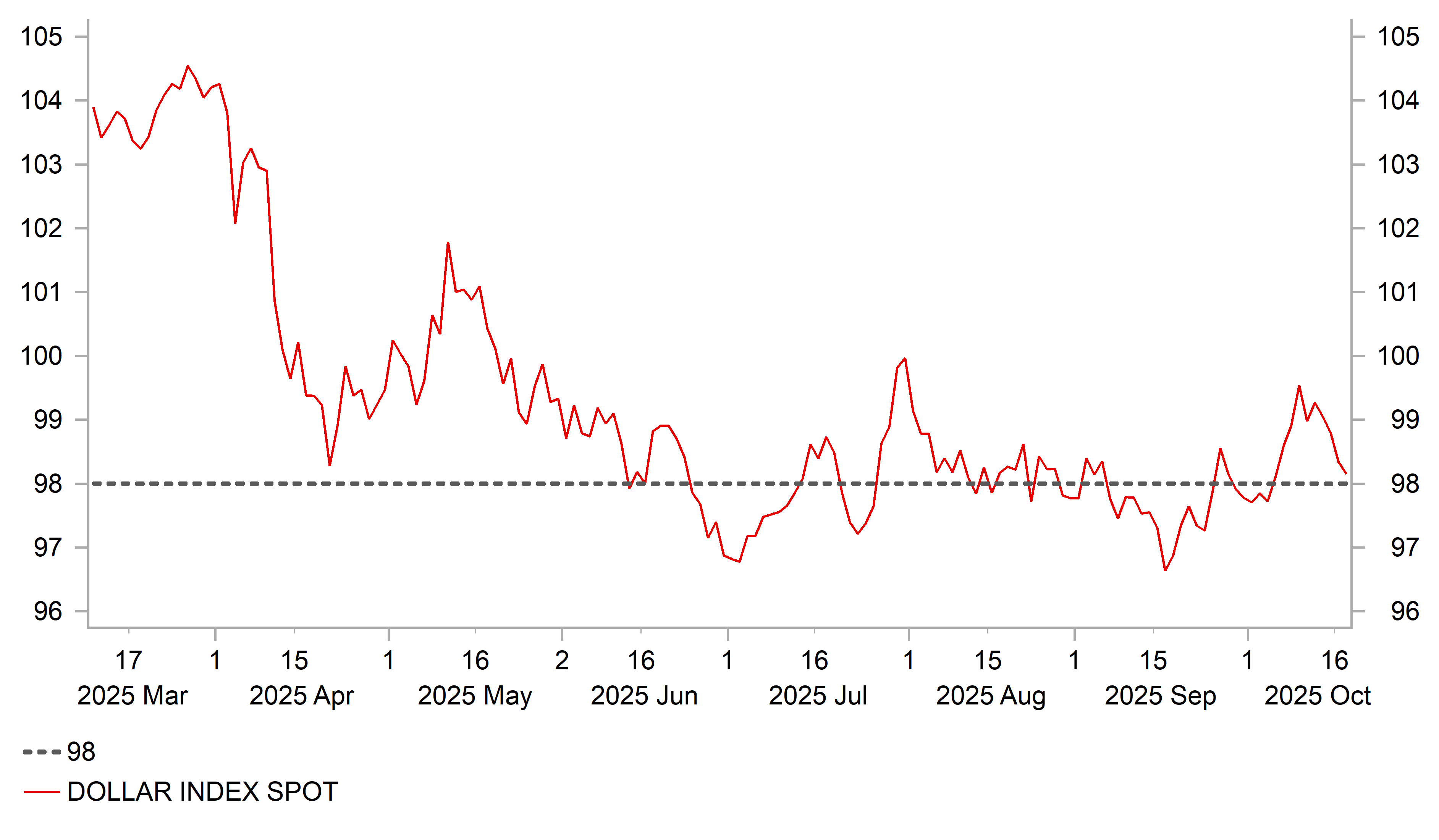 The US dollar has continued to weaken overnight resulting in the dollar index falling back towards the 98.000-level. It has now almost fully reversed the gains it made during the prior week on the back of heightened political uncertainty in France and Japan which lifted the dollar index up to a high of 99.563 on 9th October. The reversal of those dollar gains over the past week has been encouraged an easing of political uncertainty in France and Japan. French Prime Minister Lecornu survived two no-confidence votes yesterday after announcing plans to suspend pension reforms until after the next Presidential election in 2027. The first no confidence motion proposed by the far left France Unbowed party was defeated when 271 lawmakers backed it which fell short of the 289 majority required to force the prime minister to resign. The second no confidence motion proposed by the far right National Rally party received even less support when only 144 lawmakers voting in favour. It provides more breathing room for Prime Minister Lecornu to put together a budget for next year although it remains far from clear that his budget will pass smoothly through parliament. Political uncertainty could flare up again later this year if the proposed budget for next year fails to pass through parliament. Please see our latest FX Focus report (click here) released yesterday for further insights into political, trade and debasement risks currently impacting the FX market.