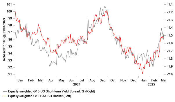 The weaker USD and lower US yields are providing a tailwind for emerging market currencies. Building fears over slower US growth in response to heightened policy uncertainty and trade tariffs have hurt business and consumer confidence. At this week’s FOMC meeting, we expect the Fed to acknowledge that downside risks to US growth have increased but still reiterate that they are not in a rush to resume rate cuts right now. The US rate market has already moved to bring forward expectations for the next Fed rate cut to June and is pricing in 2-3 further cuts in total this year which should help to dampen the negative impact on the USD from the Fed’s policy update. Please see our latest EM EMEA Weekly (click here) for more details.