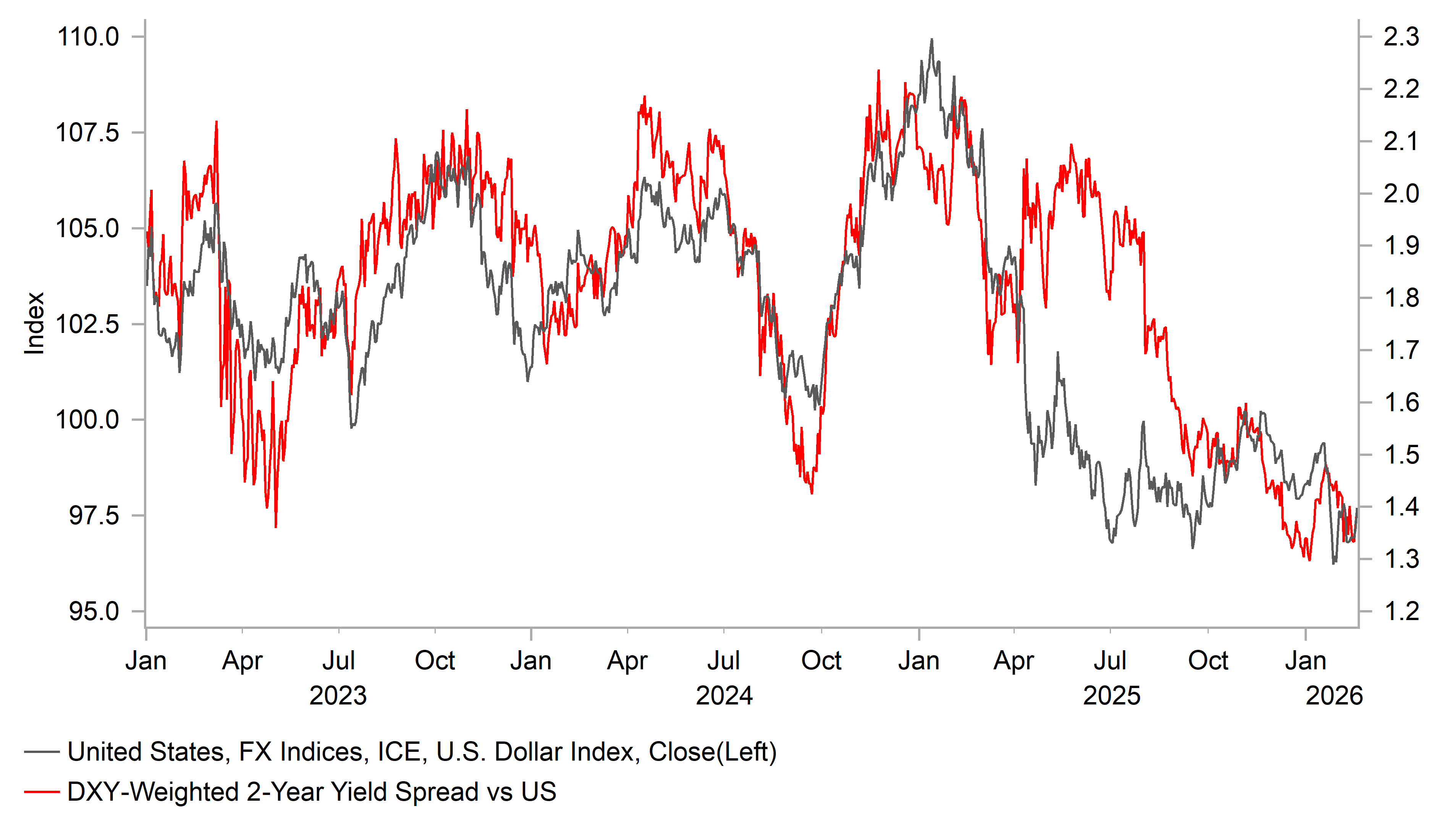 The arrival of Kevin Warsh as Fed chair could also mark the start of greater divisions within the board of Governors. On Tuesday comments from SF Fed President Daly and Governor Barr suggested they saw reason to believe AI could result in a higher long-run rate for economic growth that required higher rates. Kevin Warsh has indicated he sees AI as driving a productivity surge that allows for lower rates. Board of Governor dissents have been rare since as long back as the early years of the Greenspan Fed and increased dissents of Governors would likely be viewed by investors as a sign of the increased political influence on the Fed. Kevin Warsh will still push for rate cuts while also argue the need for a smaller balance sheet. While balance sheet policy changes will likely take longer (bank regulation changes required first), the implication of this policy mix would be a steeper yield curve that historically tends to coincide with US dollar depreciation.