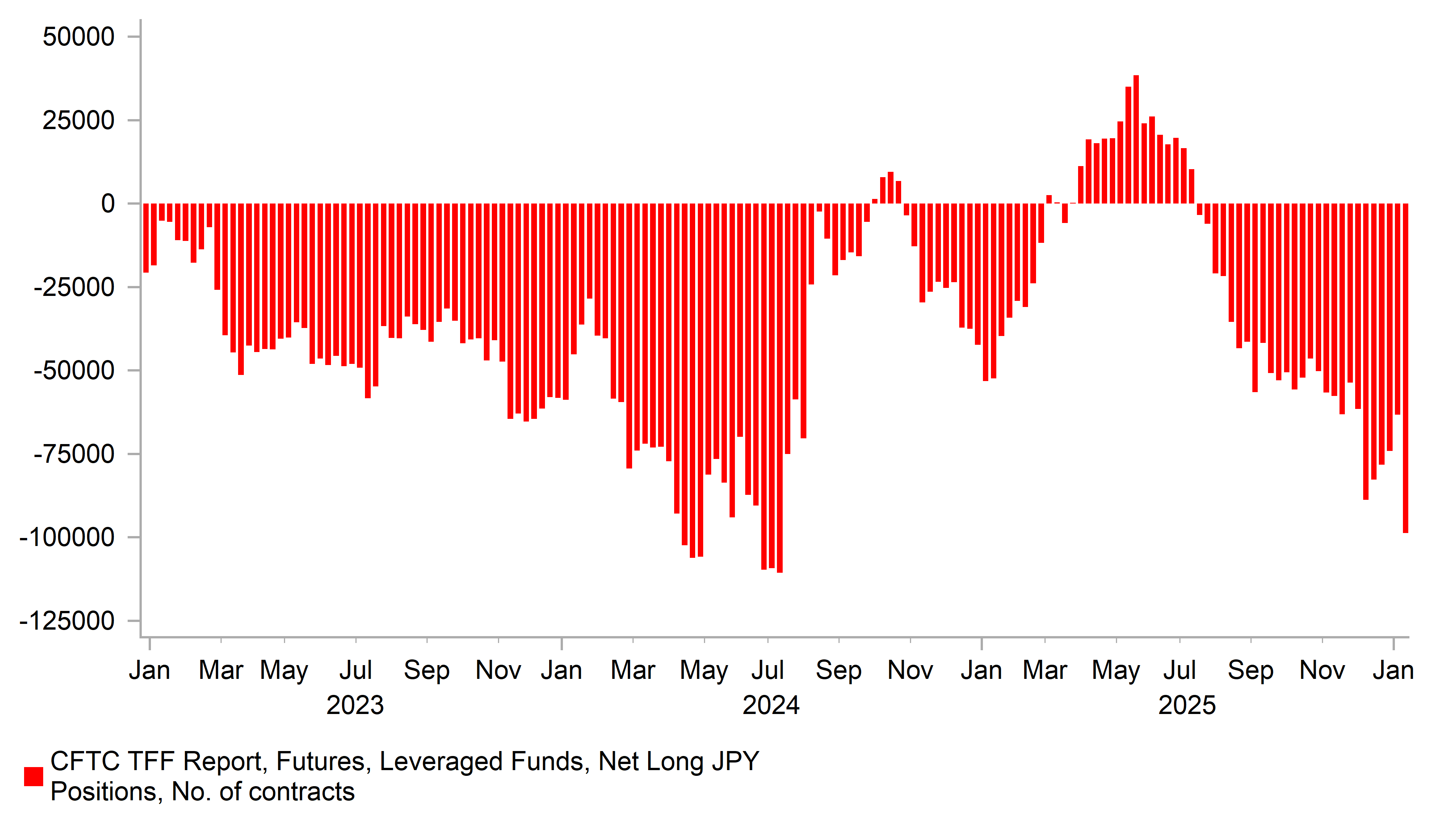 What this very big yen selling indicates is that market participants don’t appear particularly concerned over the risk of intervention – we had already had rhetoric from Japanese authorities although that rhetoric has intensified since last Tuesday that covers the positioning data. But the rebound of the yen has been relatively modest despite the notable increase. Yen shorts now total 99k amongst Leveraged Funds, the biggest short since the week before that July 2024 intervention. So from a measure of speculation being behind the JPY weakness rather than fundamentals, the MoF could certainly cite this data. The MoF specifically cited 9th January as a day of excessive moves which this data implies was possibly fuelled by speculative moves. We still remain sceptical of intervention being successful on a sustained basis and would need fundamental supportive JPY factors to play out as well. Moves in JPY today are certainly more contained. The JGB market has seen heavy selling with yields surging but the yen remains modestly stronger, perhaps reflecting Trump trade uncertainties that has put downward pressure on the dollar today. We would still argue though that the JGB sell-off is a negative for the yen.