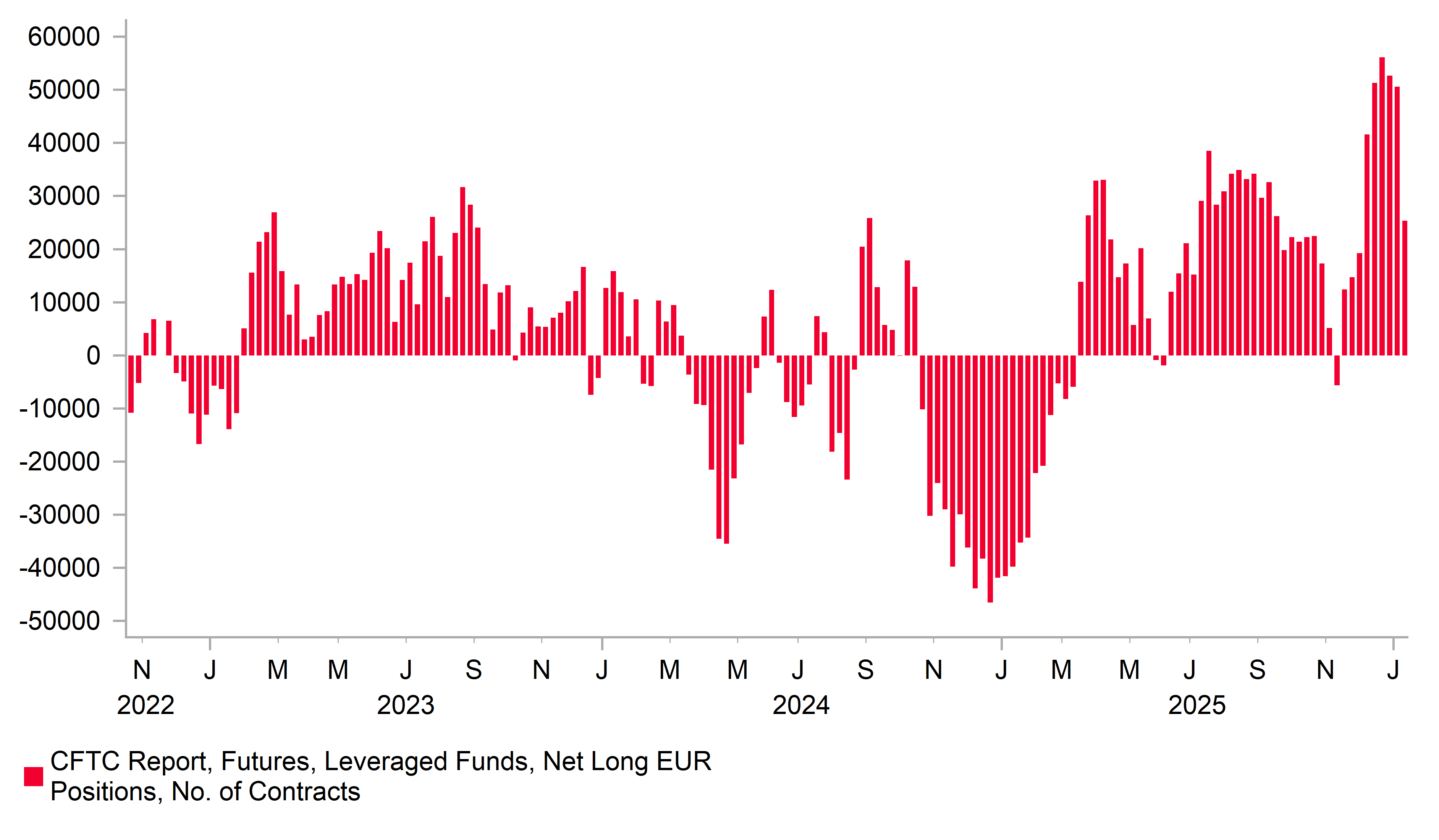 We had highlighted the fact in previous FX Weeklies that EUR positioning was beginning to look stretched and that could trigger some reversal and liquidation. The Leveraged Funds’ long position in EUR hit over 56k at the end of last year, which was the highest total since February 2018, after which FX momentum shifted during Trump’s first term in office. A 10% drop in 2017 turned out to be a one-off and Trump’s aggressive trade policy and Fed rate hikes helped see a sustained turnaround in EUR and by May 2018 Leveraged Funds were running net shorts.