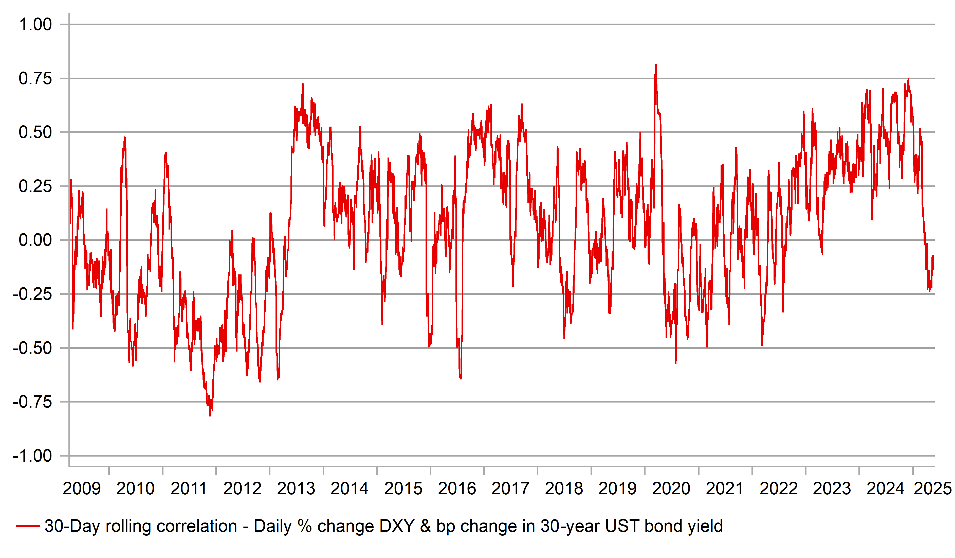30YR UST BOND YIELD CORRELATION WITH THE US DOLLAR HAS TURNED NEGATIVE