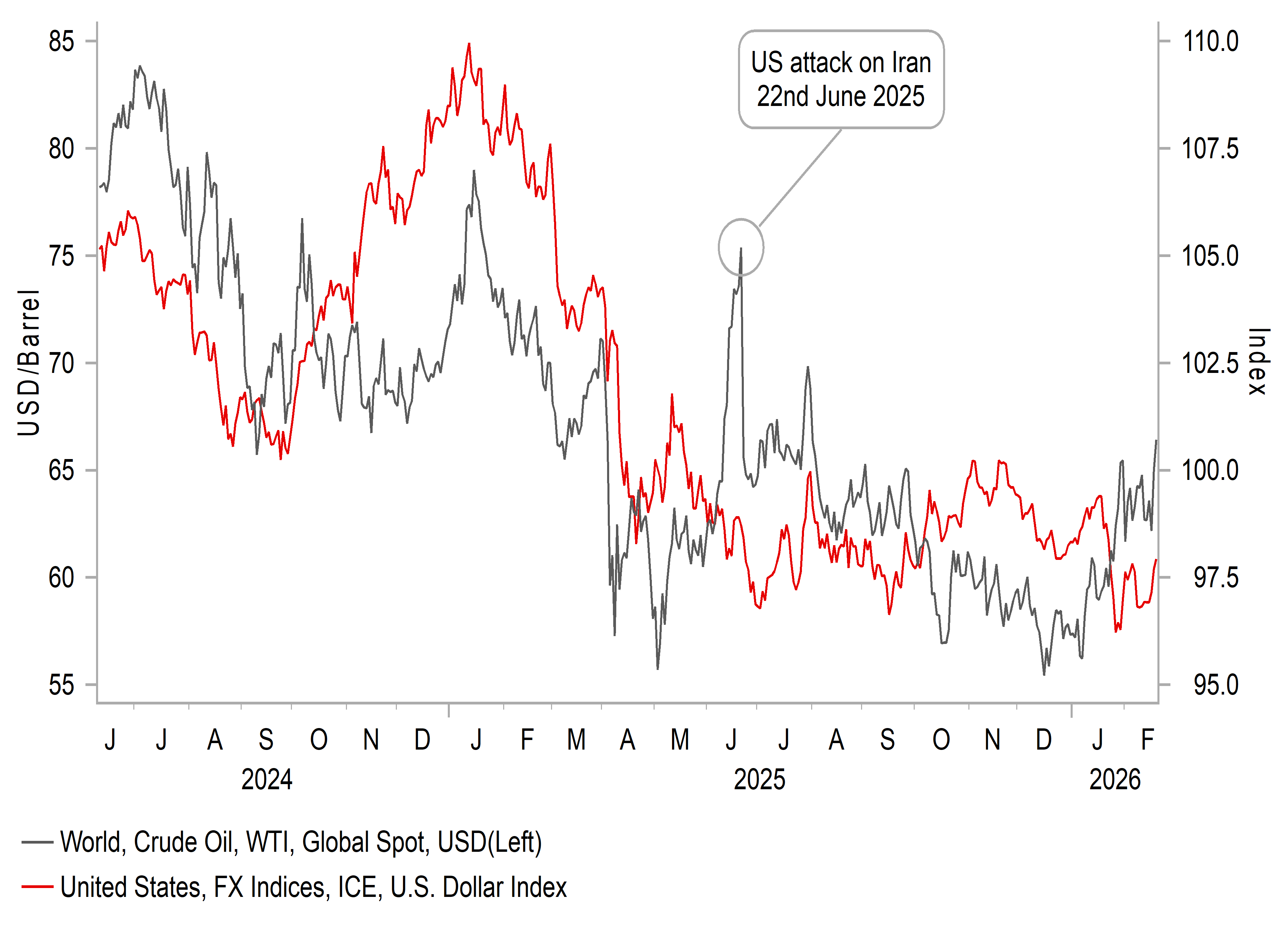 The US dollar has gained modestly further with the focus on the risk of an imminent attack on Iran by the US as the build-up of military presence in the region continues. From the intra-day low recorded on Tuesday, Brent crude oil is now 8% higher and at a level not seen since July last year. President Trump stated that Iran has “10-15 days” to do a deal which could of course mean a lot less – weekends are the times in the past for US attacks and hence investors will likely be positioning for the possibility of an attack over the weekend. The build-up to when the US attacked Iran last year (22nd June) saw crude oil surged nearly 20% in the eight trading days before and the dollar advanced by a little over 1.0%. The move isn’t yet that big in crude oil but similar in FX and with the positioning of late in FX, we could certainly see a scenario of further near-term gains.