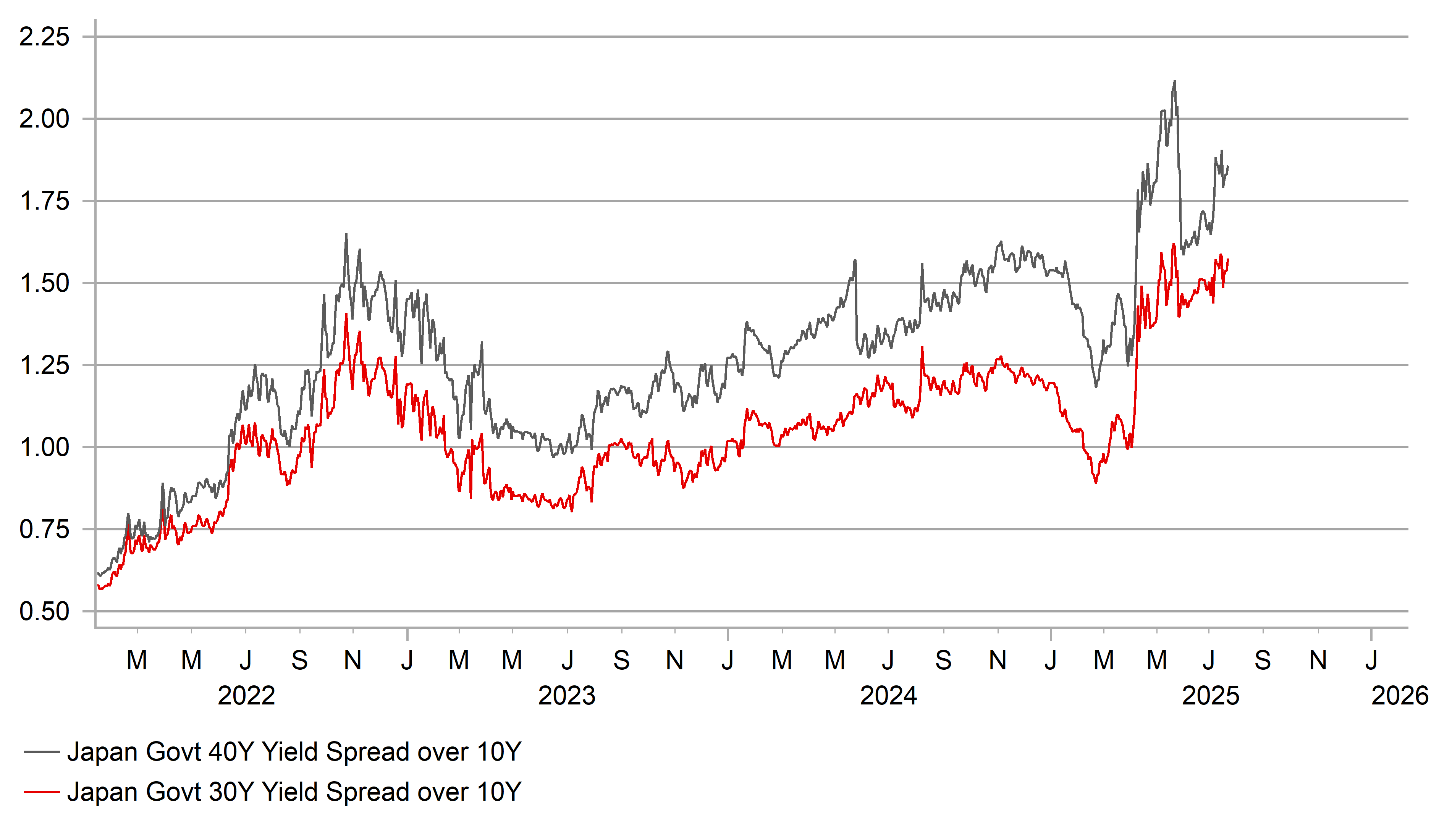 What remains clear at this early stage is that the political uncertainty and the potential for a resignation will likely remain high especially if Japan fails to reach a satisfactory trade deal with the US by 1st August. Yields in the US have been declining with the 30-year UST bond yield down 6bps from Friday through to today. The 30-year JGB yield is modestly higher as fears over fiscal expansion support yields. Finance Minister Kato today repeated the government’s opposition to any lowering of the consumption tax rate but was more supportive of abolishing the gasoline tax rate. Under this government it seems unlikely we will see any notable fiscal slippage so the JGB risk is more linked to PM Ishiba’s resignation and a shift in policy. But even then, JGB market moves will likely dictate the capacity for any new government to open up the fiscal purse. PM Ishiba previously promised no new JGB issuance to fund new spending.