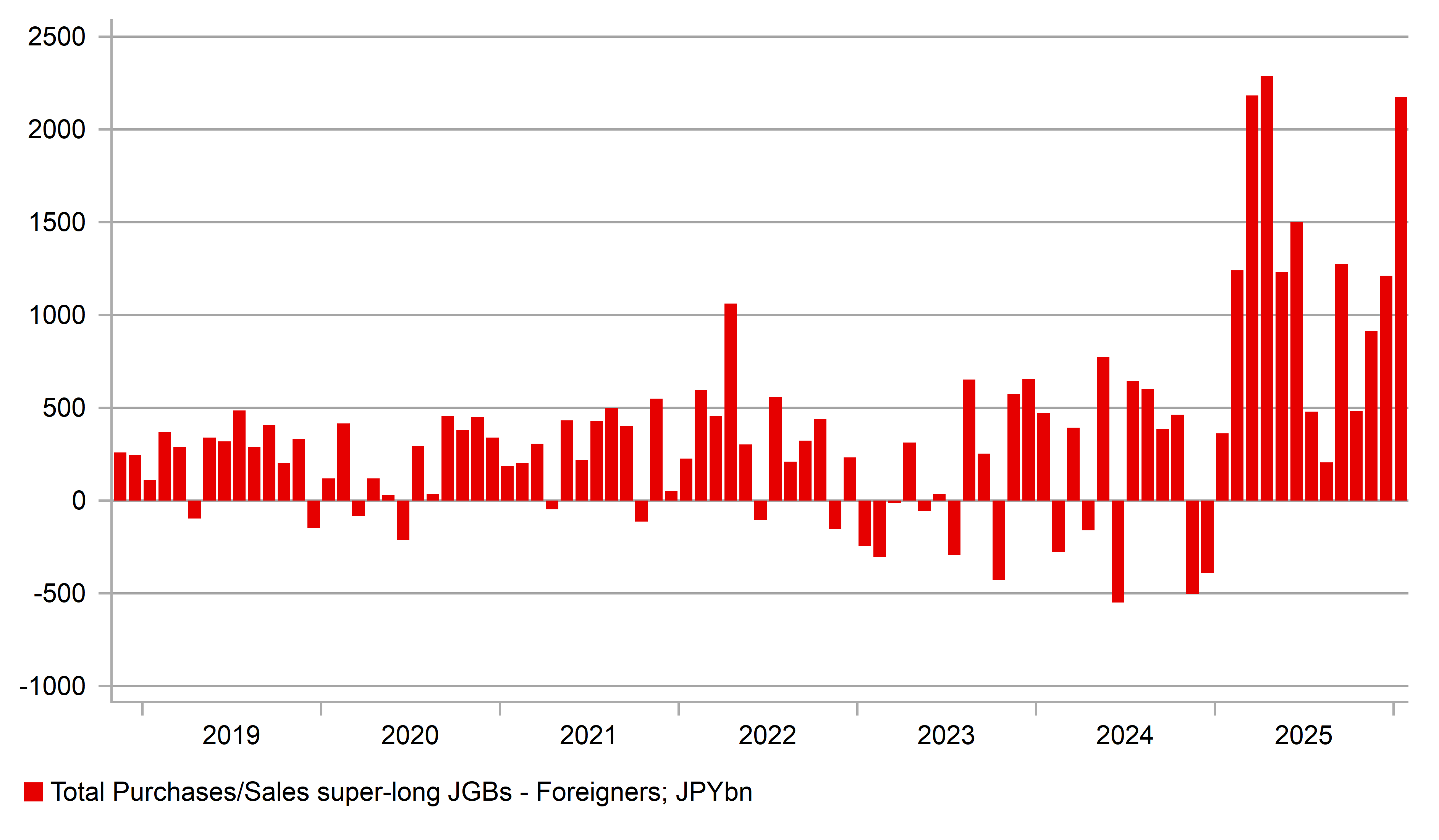 What we now know, following the release of the JSDA flow data is that foreign investor demand jumped significantly, likely drawn by the attractive yield on offer. Foreign investors bought JPY 2,175bn worth of super-long JGBs in January, the third largest monthly total. As can be seen in the chart, the foreign investor segment continues to play a key role in containing the move higher in yields and have been steady buyers since the start of 2025. The main sellers of super-long JGBs was Japan’s Life & non-Life insurance companies and to a lesser degree Japan’s regional banks. Lifers have now been heavy sellers for two consecutive months. Foreign investors were not just buyers of super-long JGBs with purchases further up the curve too with total bond purchases in January reaching JPY 6.04trn, just below the record JPY 6.08trn worth of buying back in March 2023.